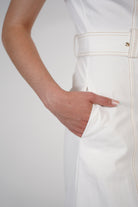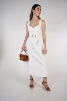 Alari Belted Maxi Dress – White Structured Dress with Belted Waist & Button Detail