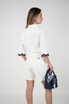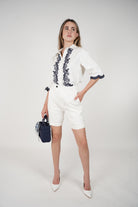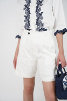Close-up of Caleni Linen Shorts in crisp white with cuffed hems and pleated front, styled with an embroidered navy and white button-down top.