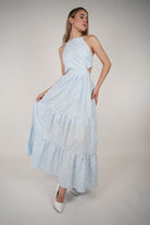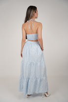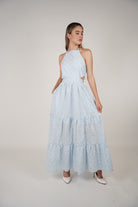 Meta Description: Fall in love with the Janel Crochet Maxi Dress. Featuring a halter neckline, tiered skirt, and side cutouts in soft blue eyelet lace – perfect for summer.