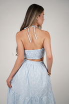 The Janel Crochet Maxi Dress blends timeless charm with modern detail. Crafted in a soft pastel blue hue, this eyelet-style maxi features an elegant halter neckline and flattering side cutouts that add a subtle touch of allure. The flowing tiered skirt offers graceful movement, making it the perfect piece for brunches, garden events, or coastal escapes.