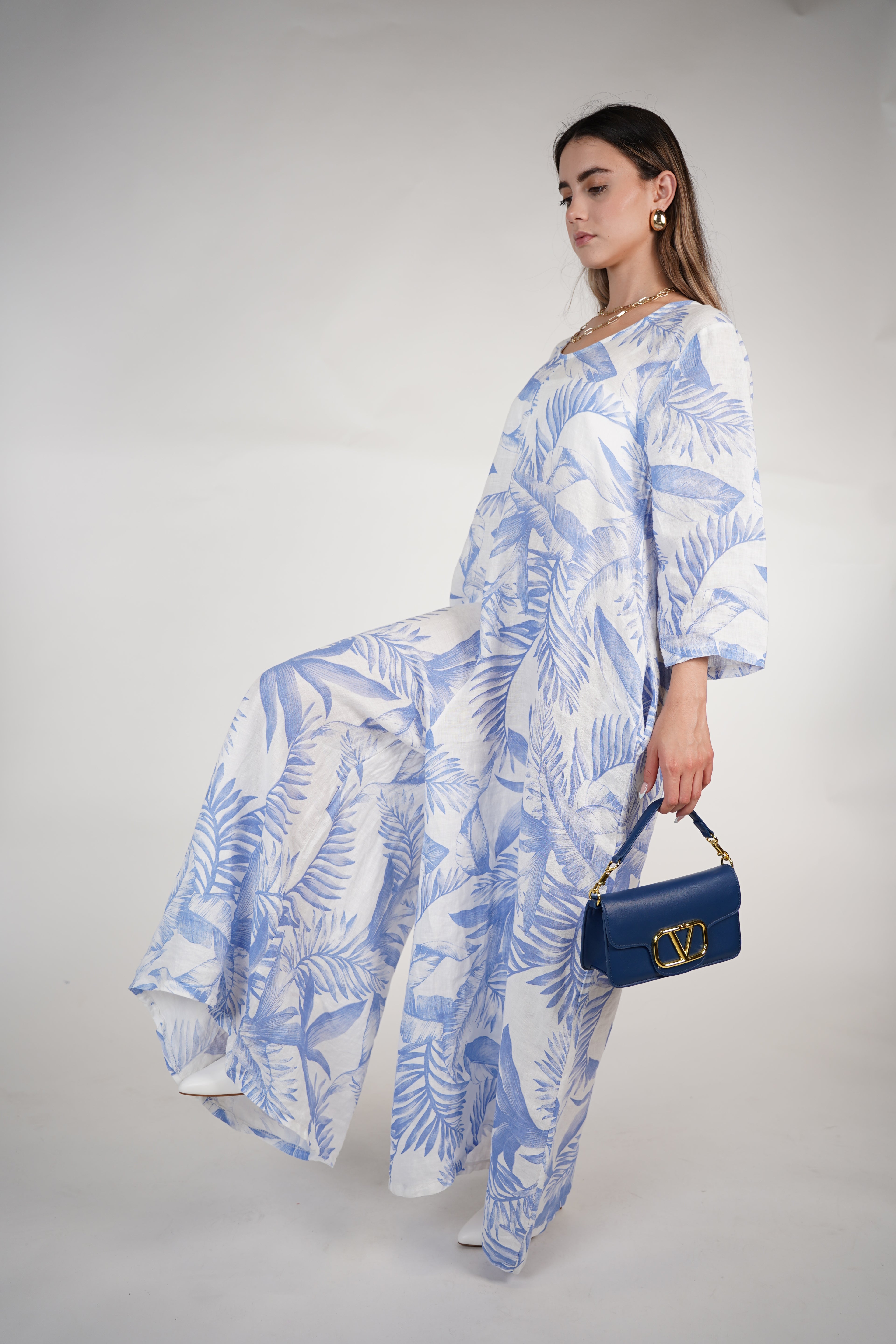 Model wearing a wide-leg blue and white palm print linen jumpsuit with long sleeves, styled with a blue handbag and white heels