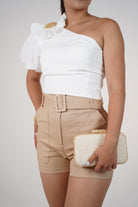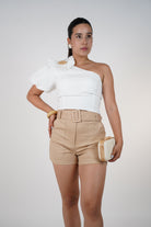 High-waisted beige belted shorts with pockets, worn with a one-shoulder top and accessories.