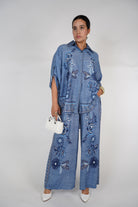 The Melin Denim Style Set combines effortless elegance with boho flair. Featuring a flowy button-down top with side slits and wide-leg matching pants, this set is adorned with intricate floral embroidery in shades of indigo, navy, and white. The soft, denim-look fabric adds texture without the weight of actual denim, making it perfect for warm days or vacation styling. Wear it as a coordinated look or mix the pieces with your wardrobe staples.
