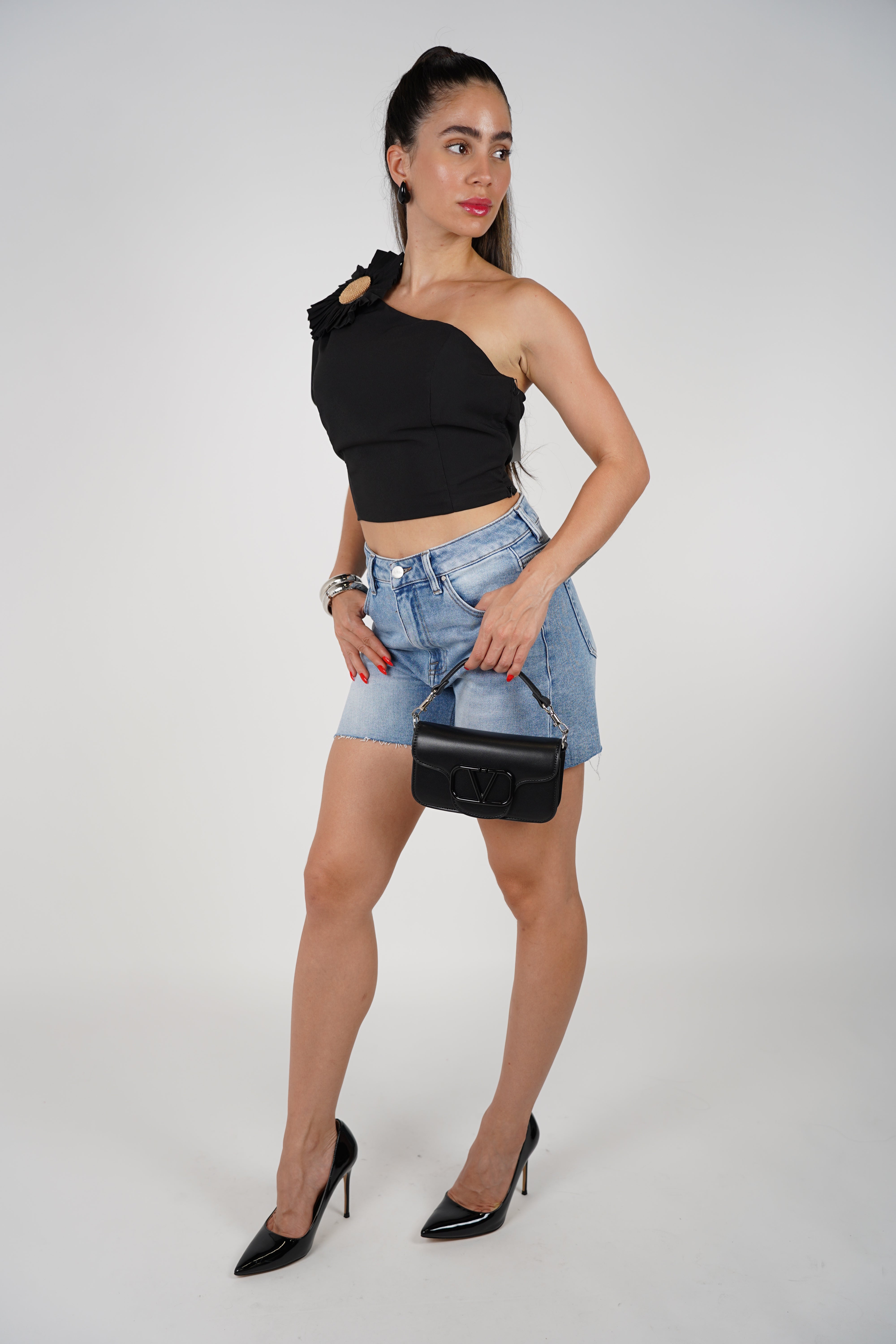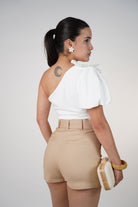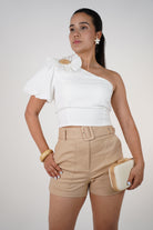 White one-shoulder puff sleeve top with pleated flower accent on model styled with beige shorts.