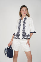 Model wearing the Rihanna Embroidered Button Down featuring white fabric with navy floral embroidery, scalloped hem, and short sleeves, paired with white shorts and a navy handbag.