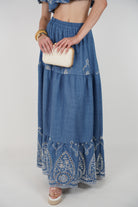 Meta Description: Shop the Sadelyn Embroidered Skirt Set with an off-shoulder embroidered top and tiered maxi skirt in denim-blue. Perfect for summer boho style.