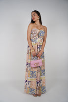 The Teyla Jumpsuit brings effortless elegance to your wardrobe with its colorful patch print and flattering strapless silhouette. Designed with a structured bodice and an eye-catching bow at the front, this one-piece flows into wide-leg bottoms for an airy, comfortable fit. Whether you're heading to brunch or a summer soirée, this standout piece is the perfect mix of fun and fashion.