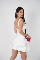 Model wearing the Thalani Mini Ruffle Dress in white, featuring a fitted silhouette and dramatic ruffled hem, paired with pink accessories.
