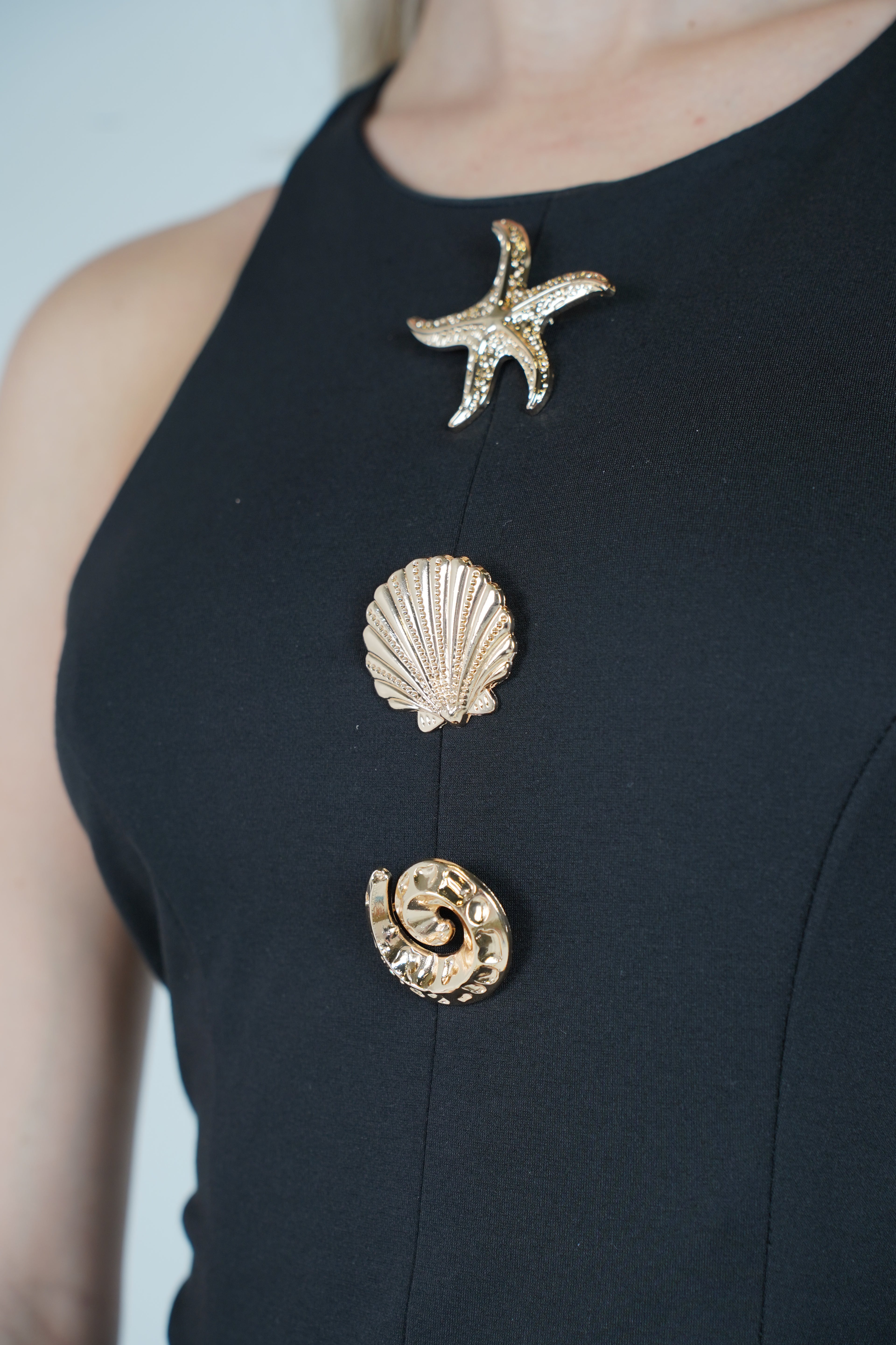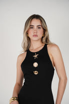 Woman wearing black mini dress with gold shell and starfish details.
