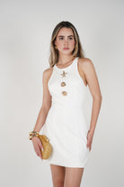 The Varese Mini Dress is designed to turn heads with its modern silhouette and unique sea-inspired gold embellishments. Featuring a flattering, fitted cut and sleek racer neckline, it transitions effortlessly from daytime brunch to evening cocktails. The luxe detailing gives this timeless mini a playful, elevated twist. Available in black and white to match any mood or occasion.