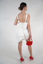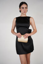 Model wearing black satin mini dress with open back and large dramatic bow detail, accessorized with black earrings and a gold clutch