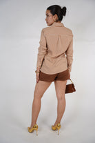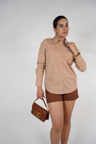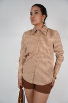 The Vienna Striped Button Down is your go-to shirt for elevated everyday dressing. Designed with vertical tan and white stripes, this classic long sleeve top features a tailored collar, full button front, and a flattering curved hemline. The structured cotton-blend fabric ensures a neat fit whether worn tucked, tied, or layered. Pair it with trousers for work or shorts for a relaxed, chic look.