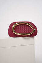 Woven plum clutch with bold sculptural gold handle placed on white surface