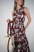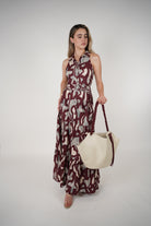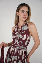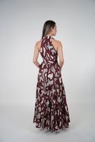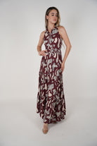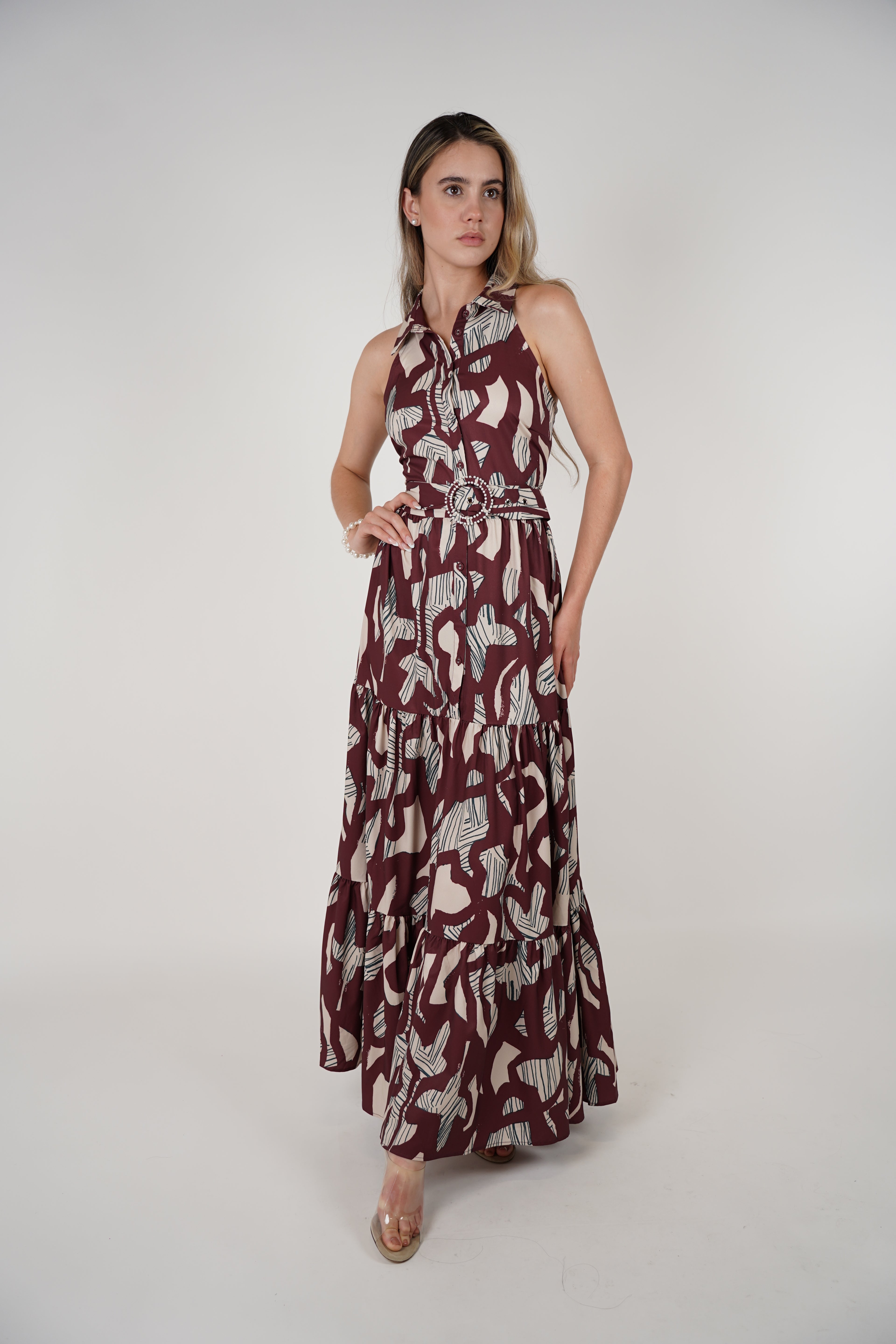 Woman wearing a sleeveless burgundy printed maxi dress with tiered skirt and matching belt.