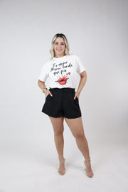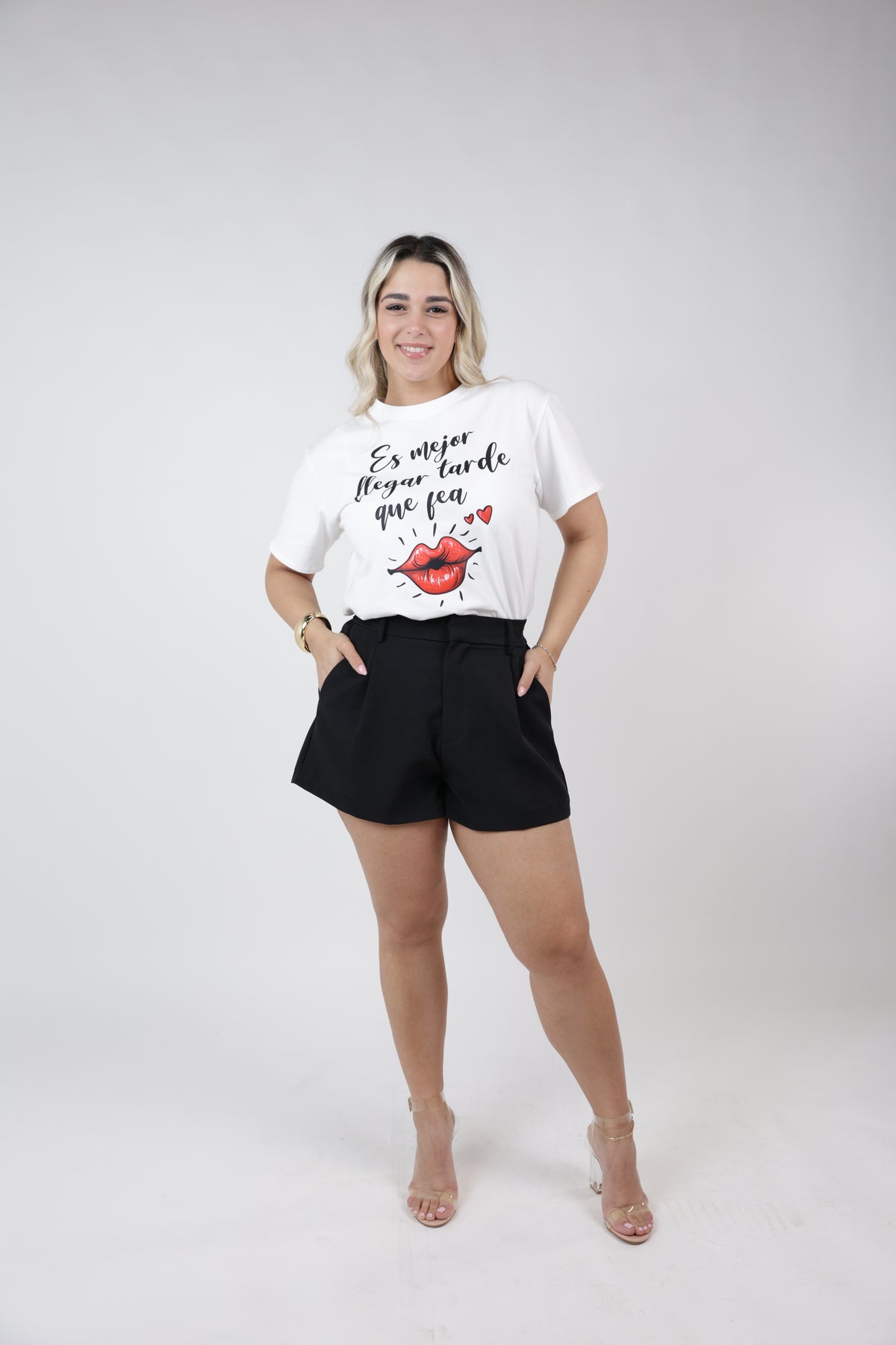 High-waisted black tailored shorts with front pleats and side pockets styled with graphic white T-shirt and heels.