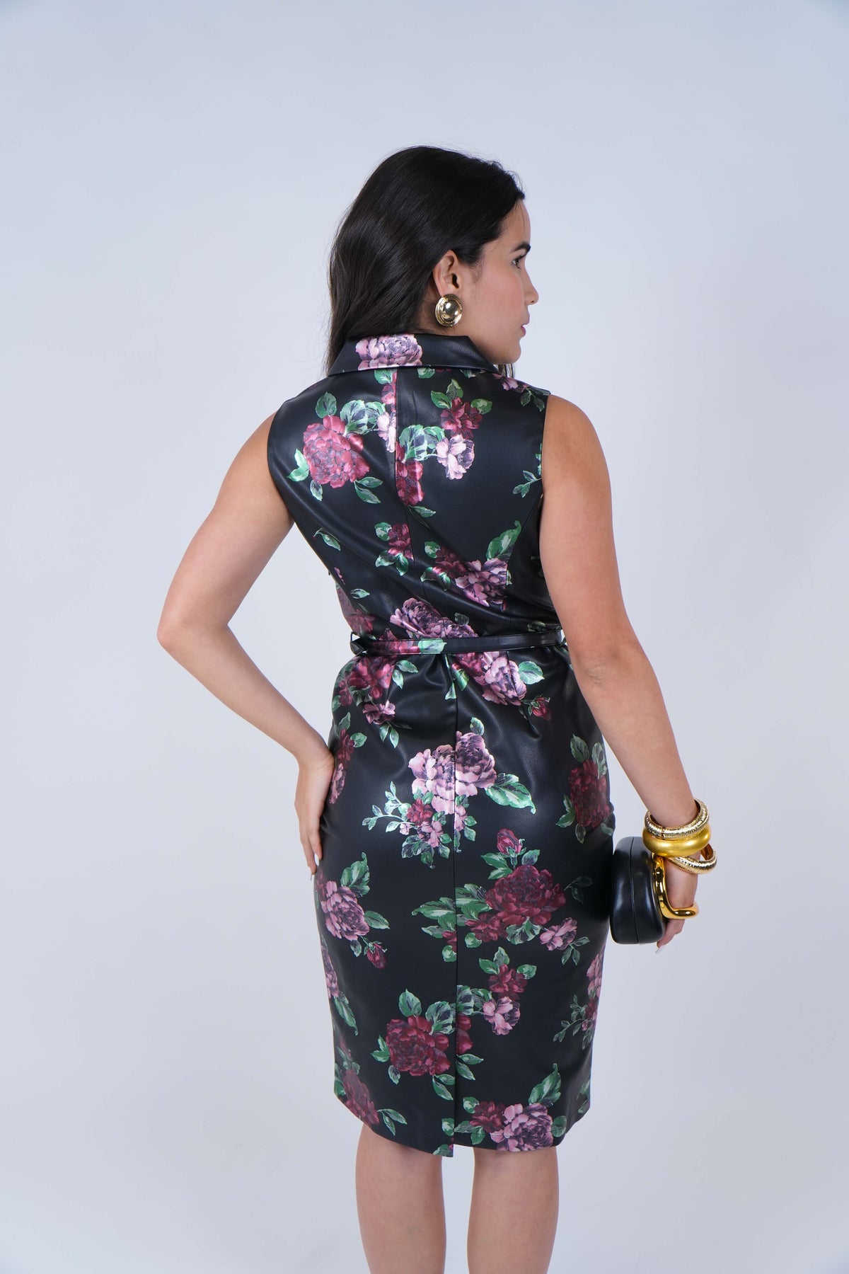 A sculpted leather-look midi dress with a refined floral print—designed for powerful, elegant, and statement-ready occasions.