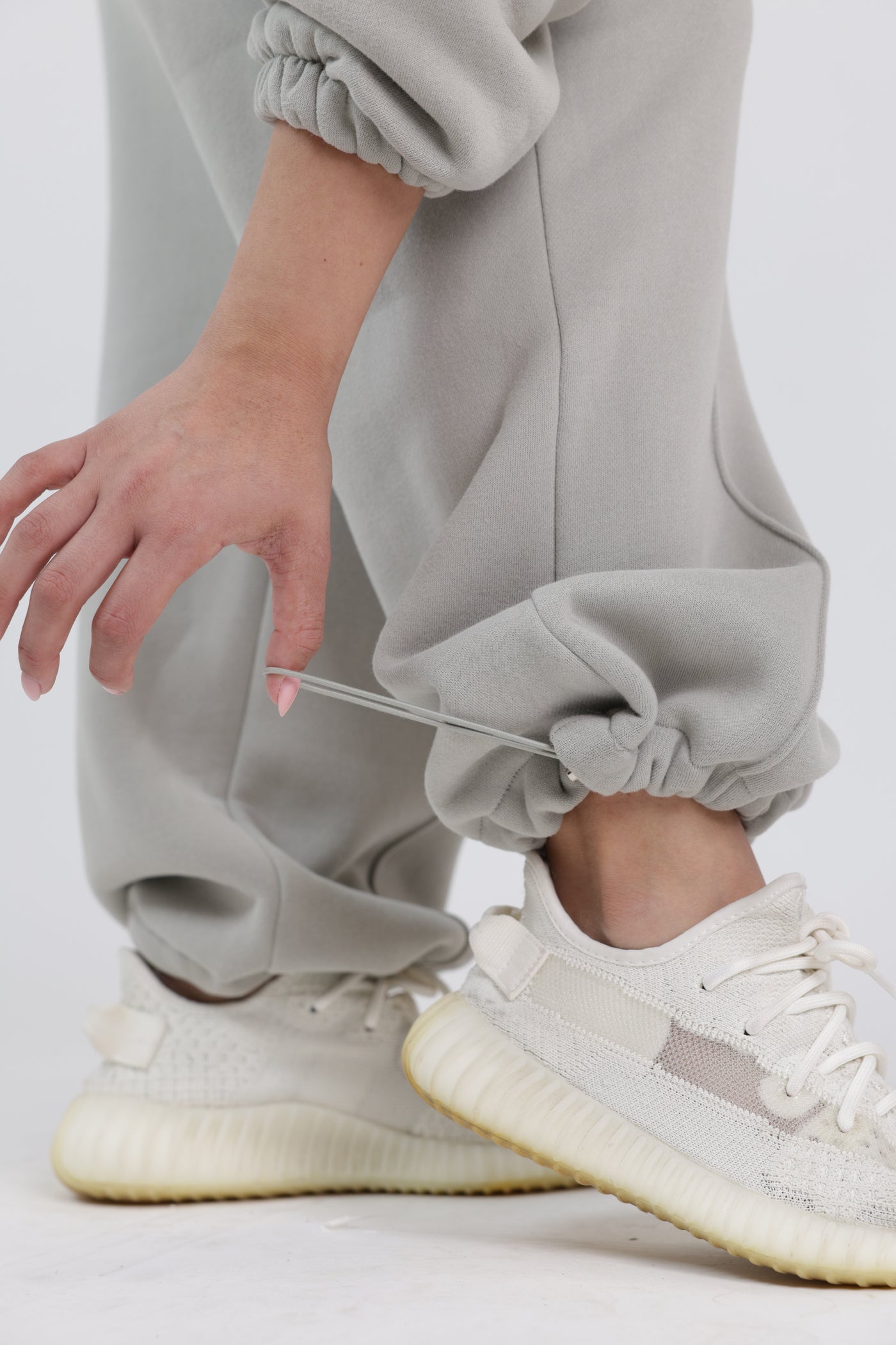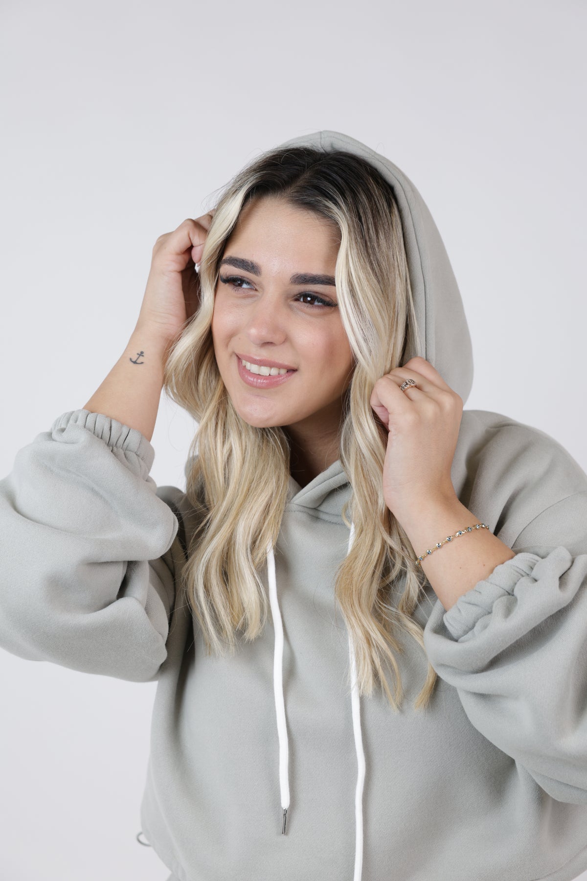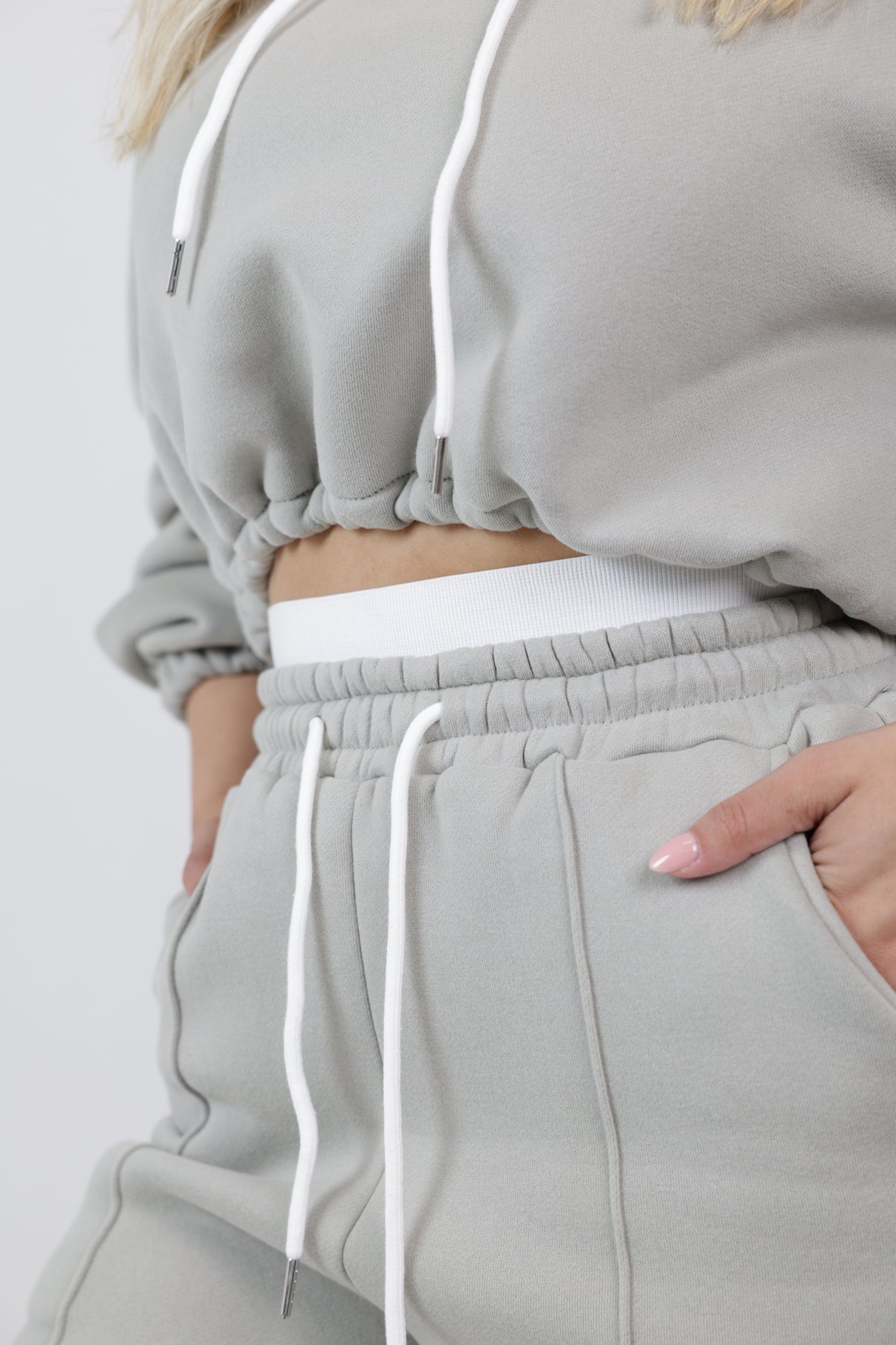 Modern sage lounge set featuring a cropped hoodie and wide-leg drawstring pants. The perfect elevated athleisure look for everyday chic comfort.