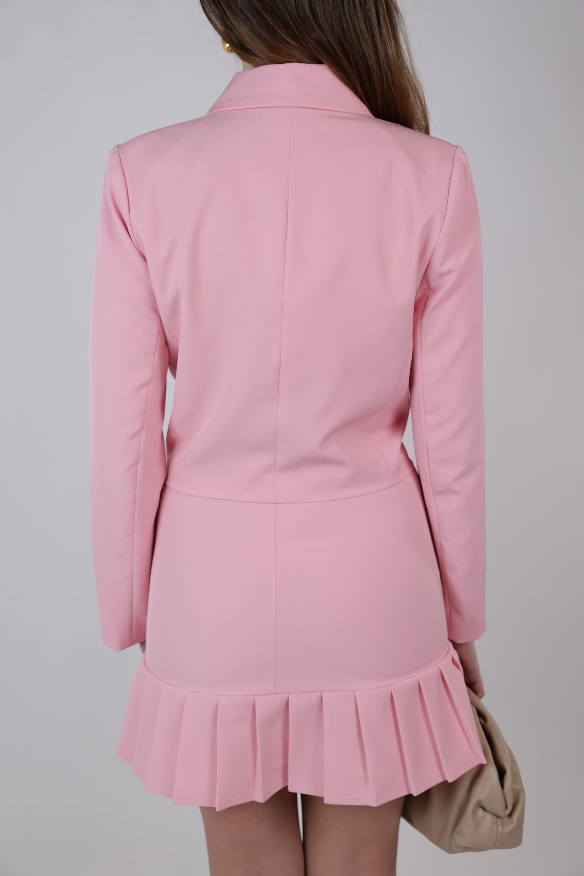 Pink structured blazer and pleated mini skirt set with gold buttons and tailored fit, styled with nude heels and neutral clutch.