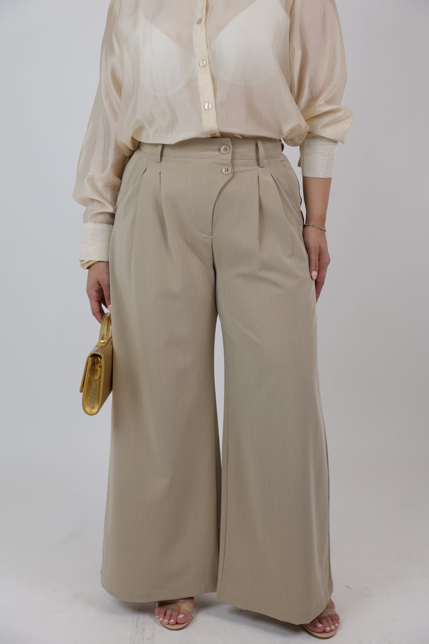 High-waisted wide-leg trousers with asymmetrical waistband detail. Structured, elongating, and designed for modern tailored styling.