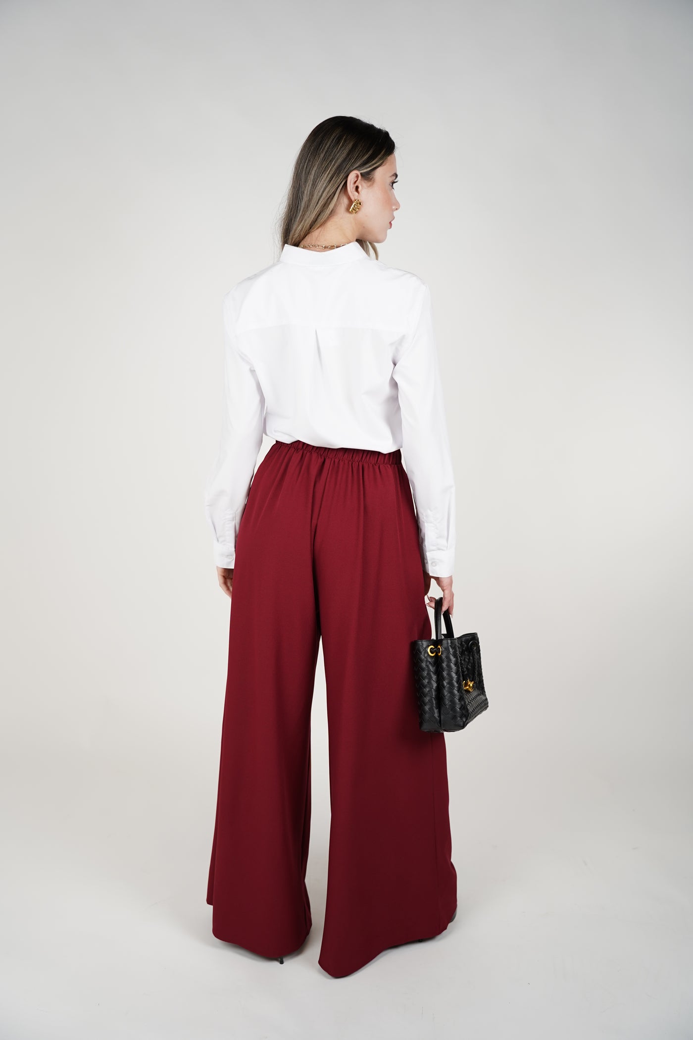 Shop the Luven Wide Leg Pants – elegant burgundy high-waisted trousers with pleats and flowy wide-leg design. Timeless and versatile from Carema Boutique.