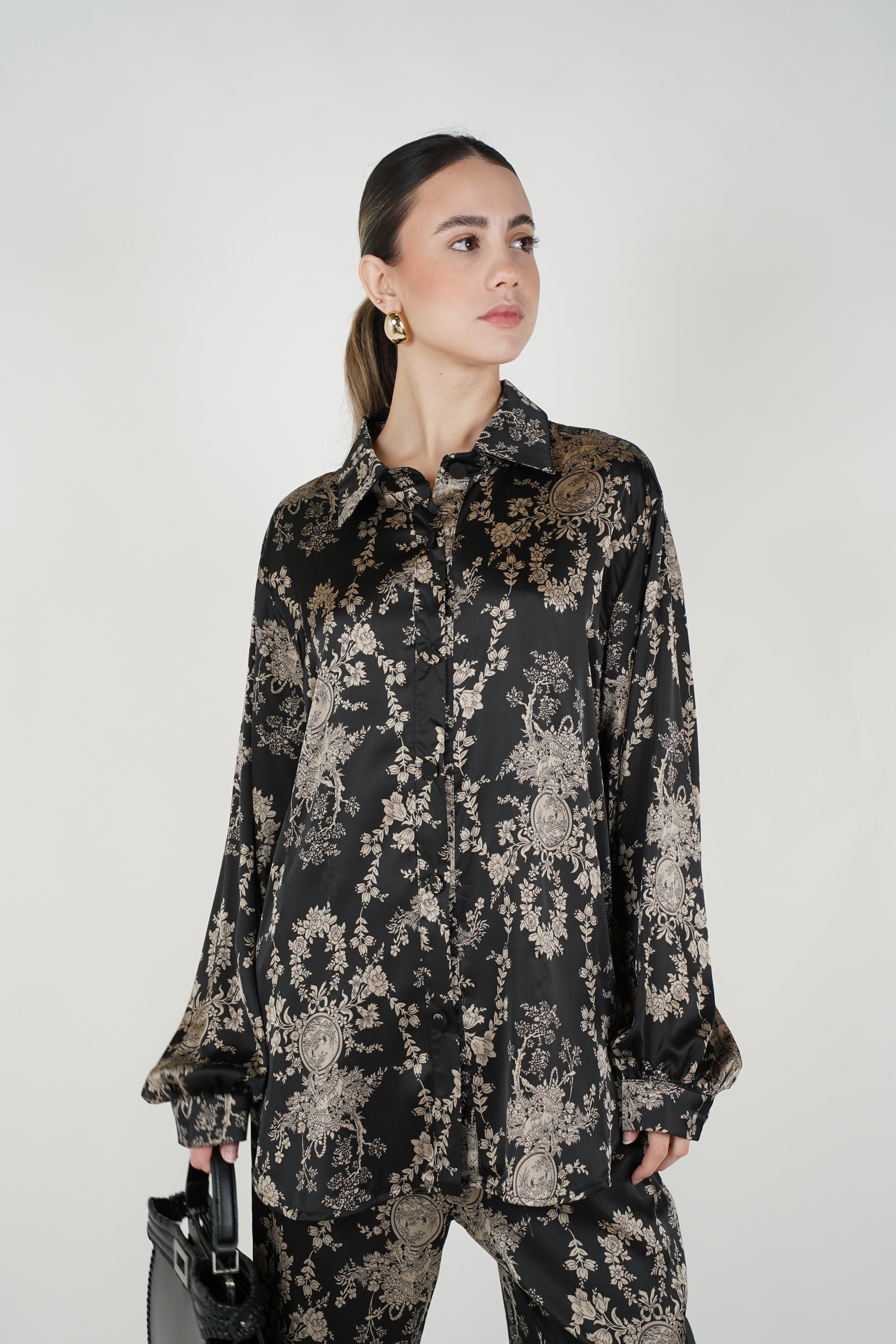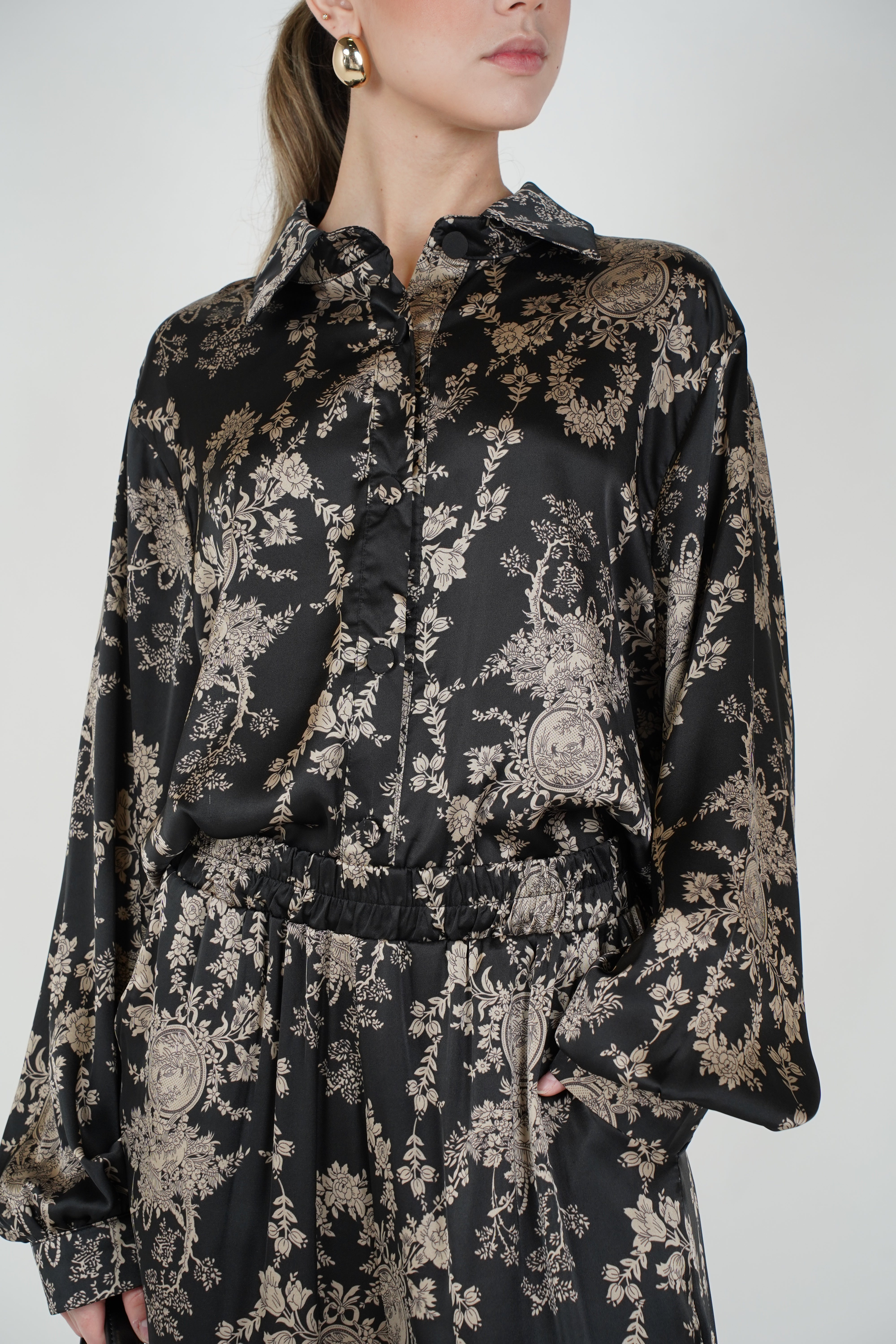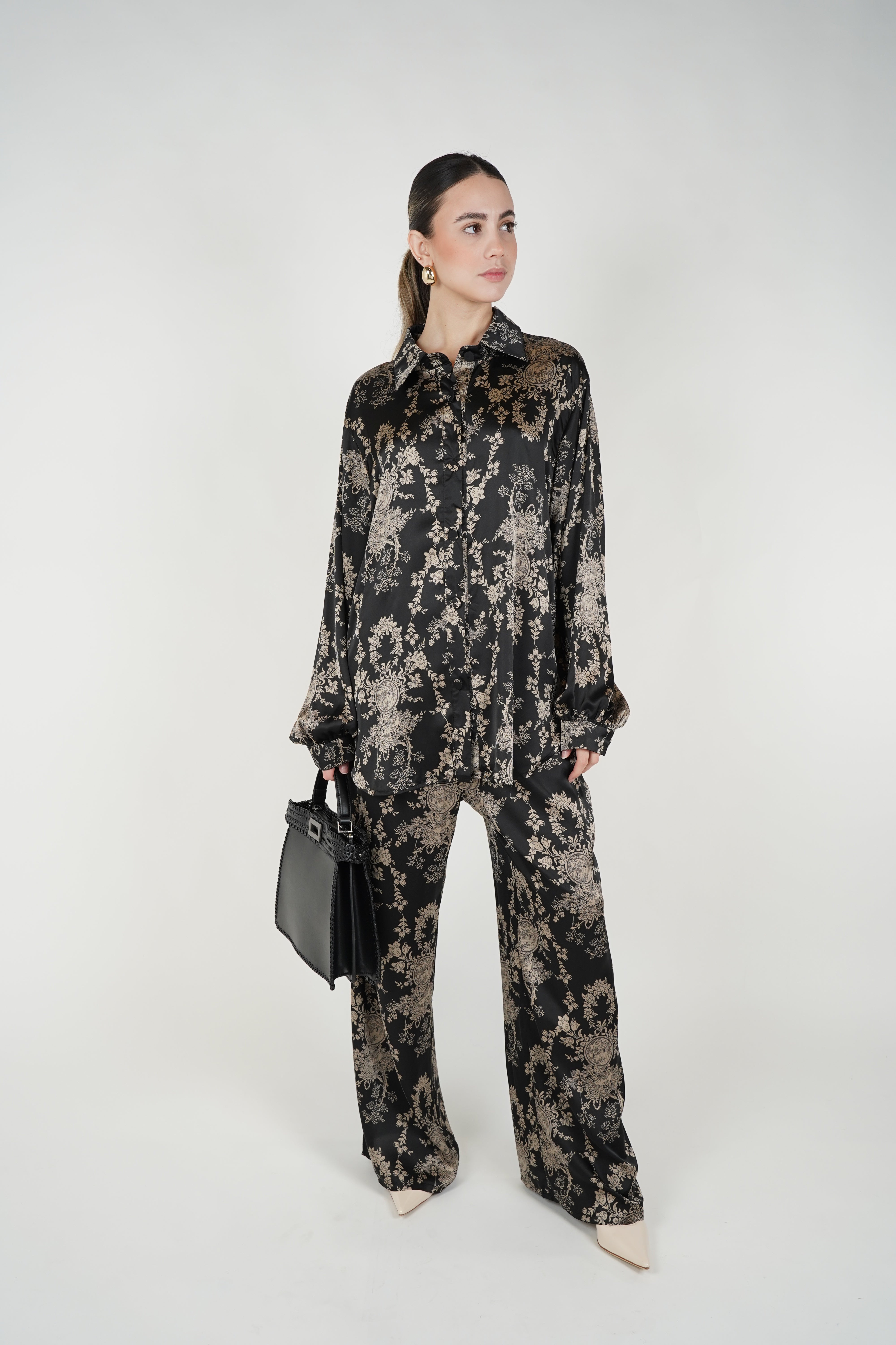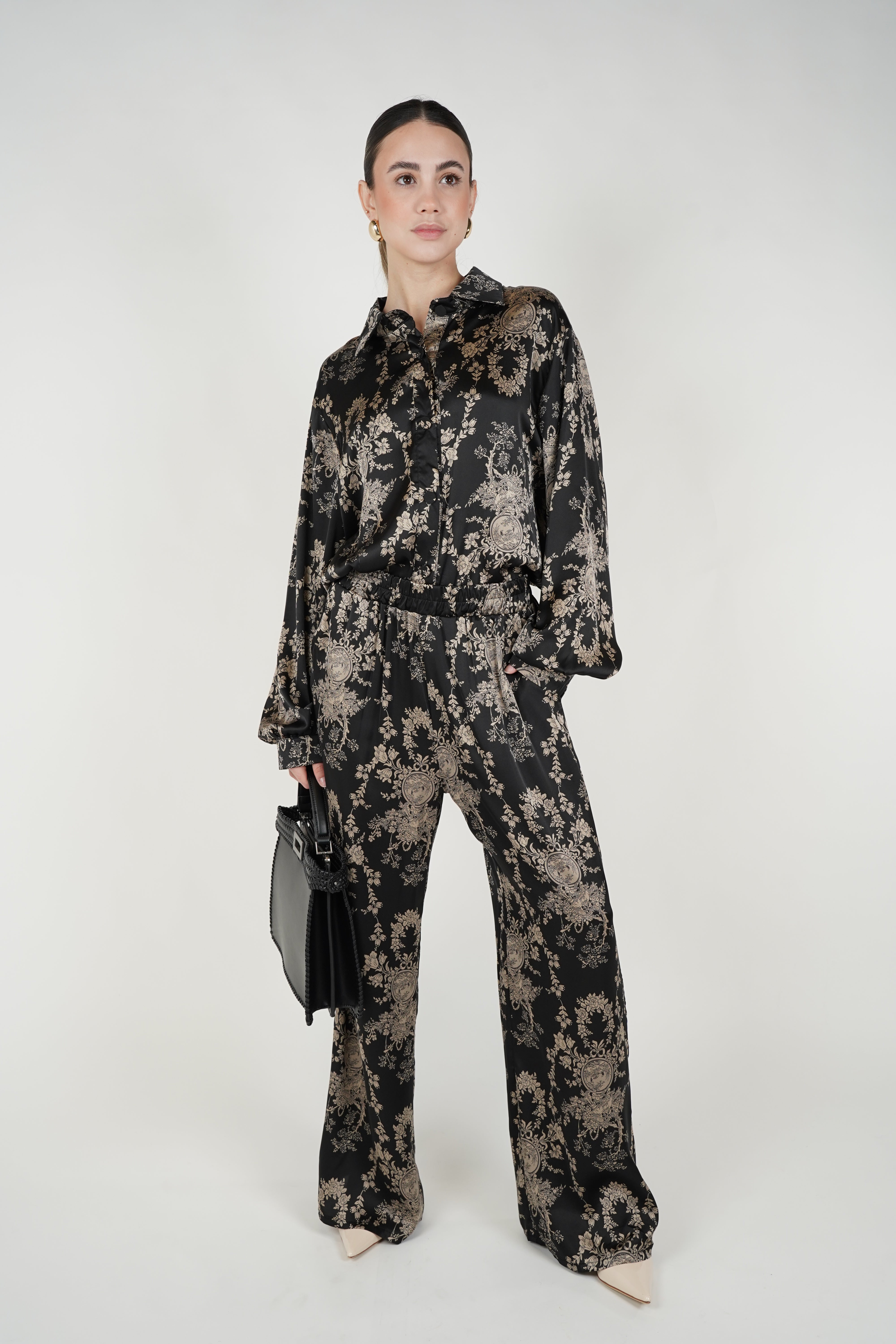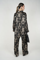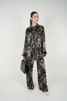A coordinated pants set featuring a relaxed button-down top and wide-leg pants with an all-over tiger-inspired stamped pattern for an elevated statement look.