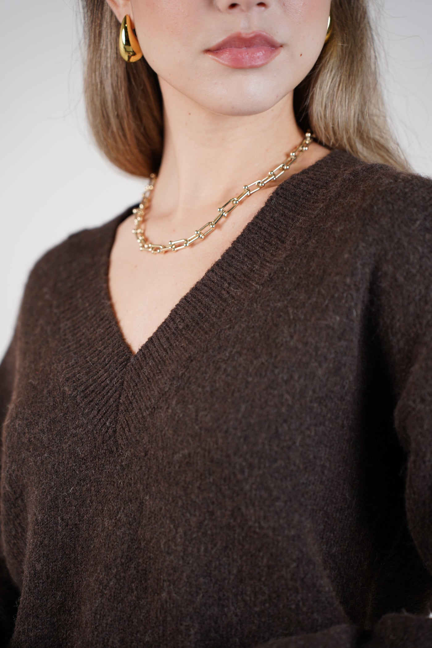 Qyra Lace Sweater | Brown Knit V-Neck Sweater with Lace Trim – Carema Boutique