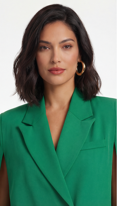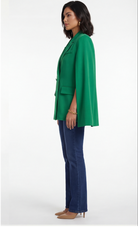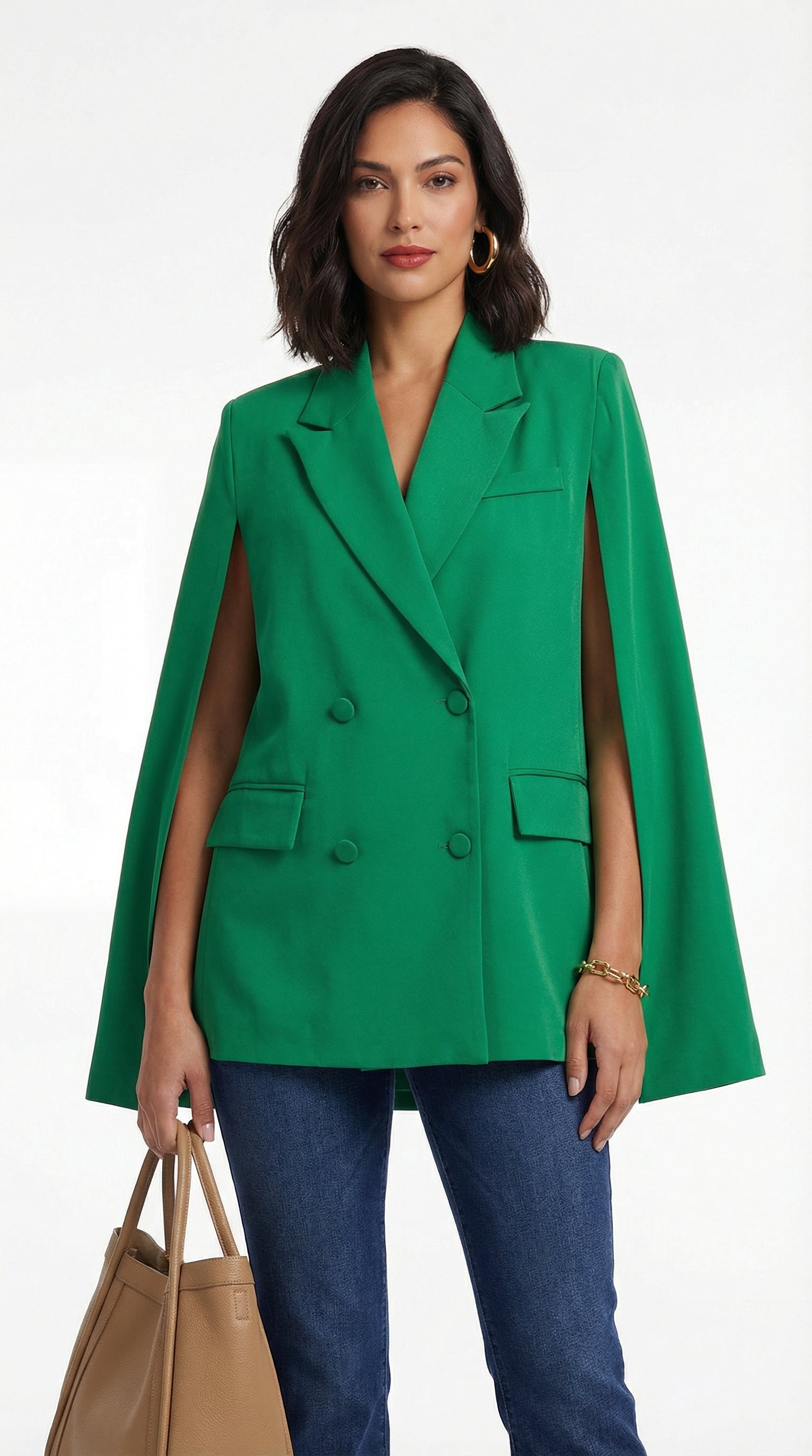 Model wearing green double-breasted cape blazer with notched lapel, slit sleeves, and tailored silhouette.