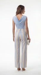Light blue and cream striped high-waisted barrel pants styled with a soft blue top and neutral heels.