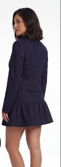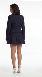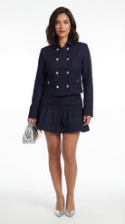 A tailored denim jacket and mini skirt set with structured elegance. The Melvia Denim Skirt Set is a timeless investment piece with modern edge.