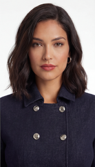 Details: Double-breasted button front, flap pockets, defined waist seam, skirt with subtle volume and clean hem.