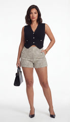 Model wearing high-rise cream and black tweed shorts with structured fit and textured woven pattern.