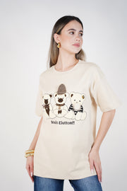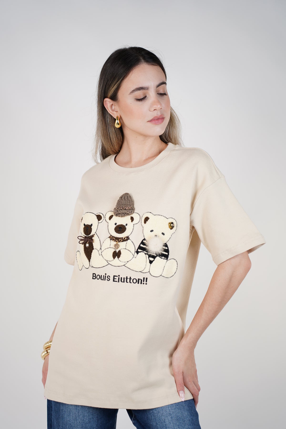 Blera Bear T-Shirt – beige graphic tee with embroidered teddy bears and relaxed fit