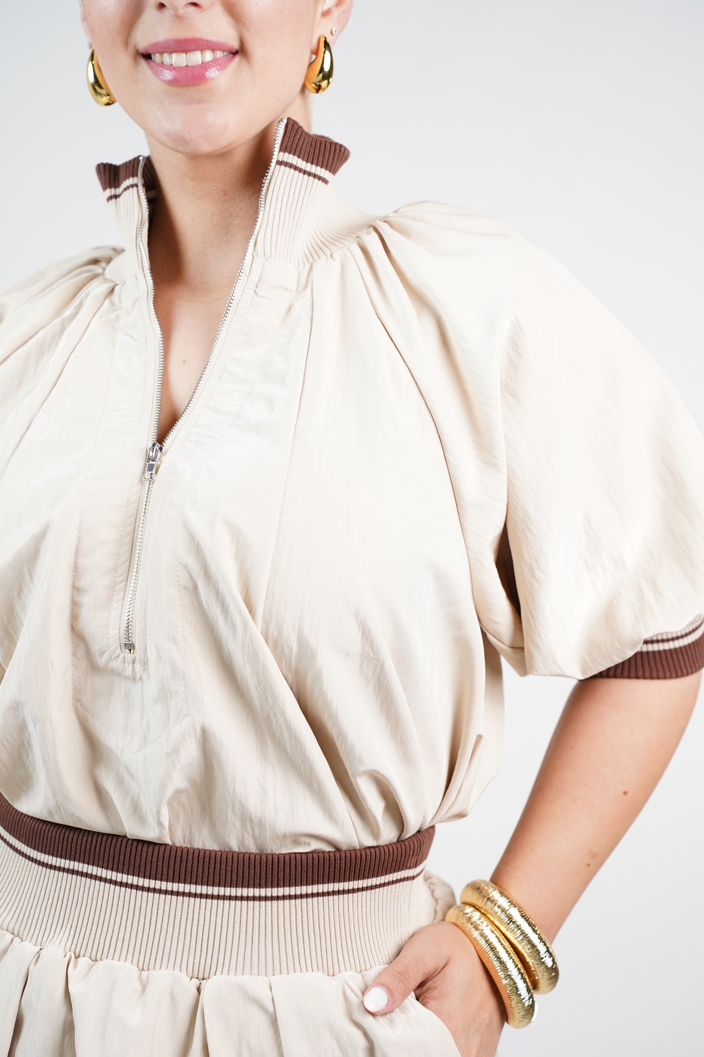 • Cropped top with short puff sleeves and a modern zip-front detail
