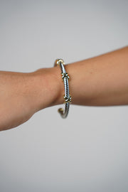 Silver twisted cable cuff bracelet with gold cross details worn on wrist