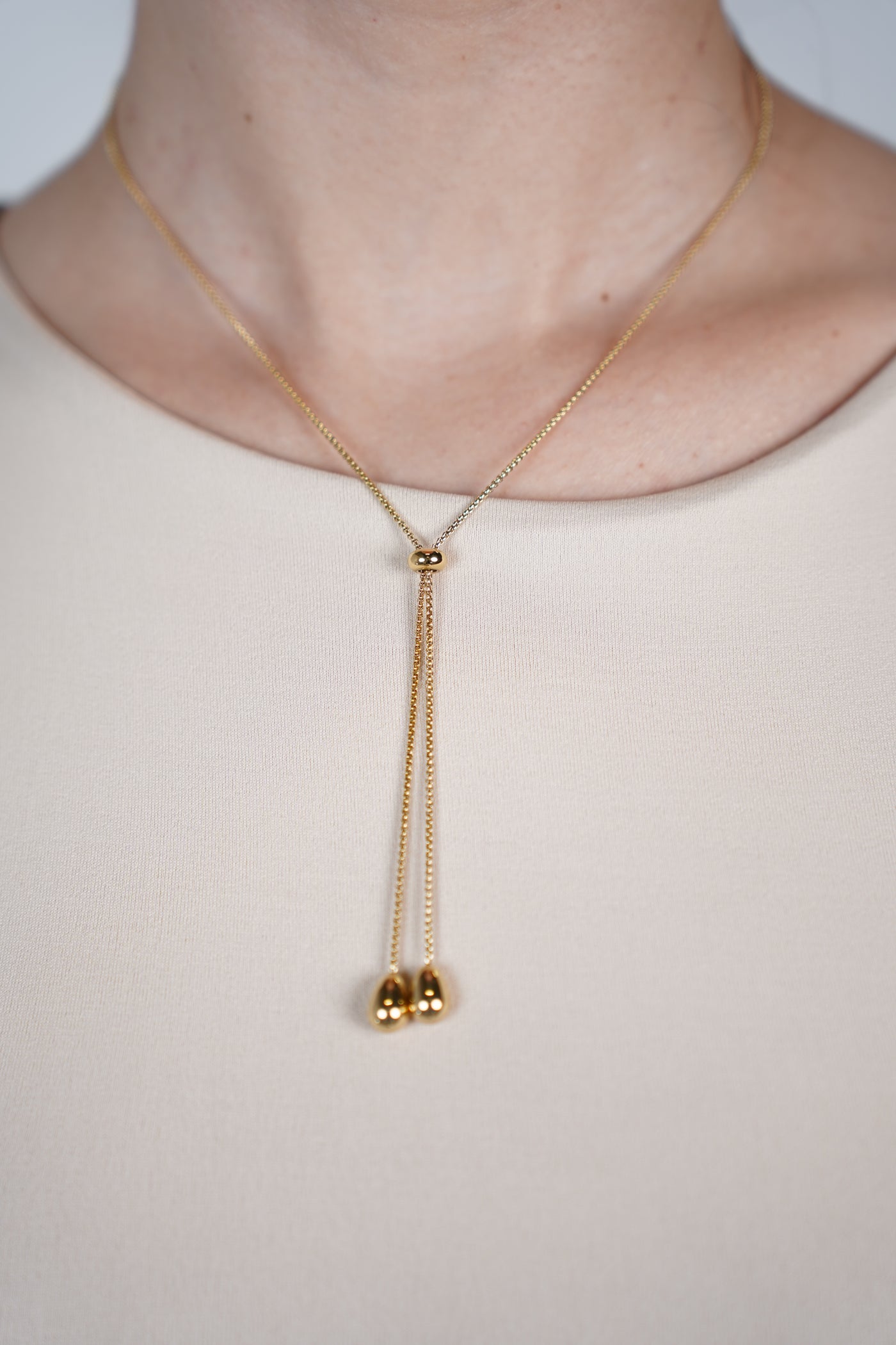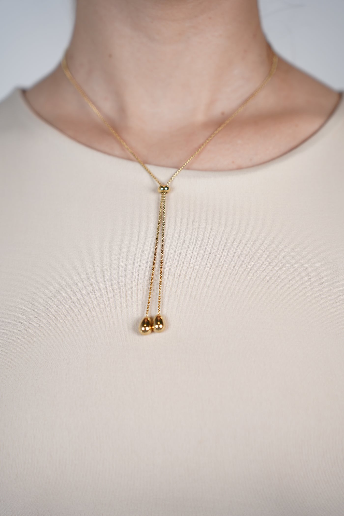Features & Benefits: - Lightweight gold-tone chain - Adjustable sliding bead design - Two teardrop-shaped pendant drops - Easy to layer or wear solo - Timeless and versatile for everyday wear