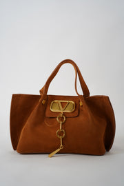 Shop the Meiz Mini Suede Tote Bag – chic brown suede tote with gold hardware. Perfect everyday handbag with modern elegance and timeless charm.
