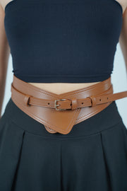 The Vena Thick Belt is designed to cinch and sculpt, offering a bold fashion-forward look that turns heads. Crafted in a rich brown faux leather with a striking pointed front detail, this belt wraps around the waist to create the illusion of a corset-like silhouette. The polished gold-tone buckle adds a refined finish, making it the perfect accessory to pair with dresses, jumpsuits, or tailored bottoms. Available in this warm brown hue and a vibrant orange tone for extra style options.