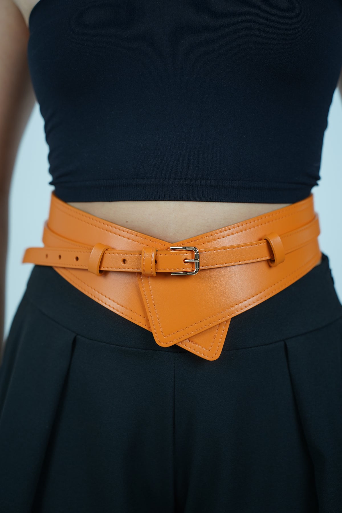 Meta Description: Shop the Vena Thick Belt, a structured faux leather belt with a bold V-front design. Available in brown and orange for chic waist-cinching style.