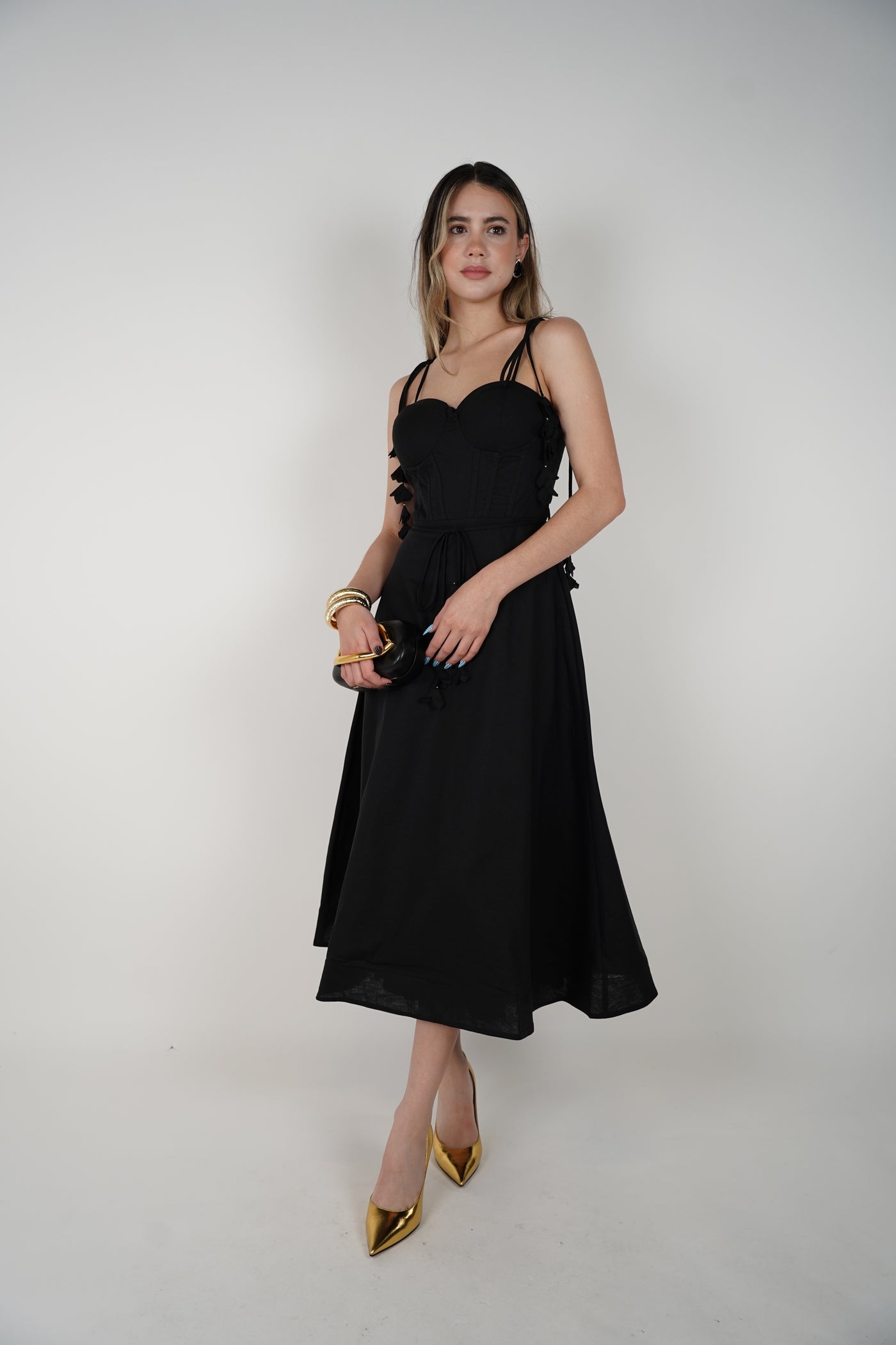 Model wearing an elegant black maxi dress with corset top, ribbon strap detailing, and flared skirt, styled with gold heels and bangles.
