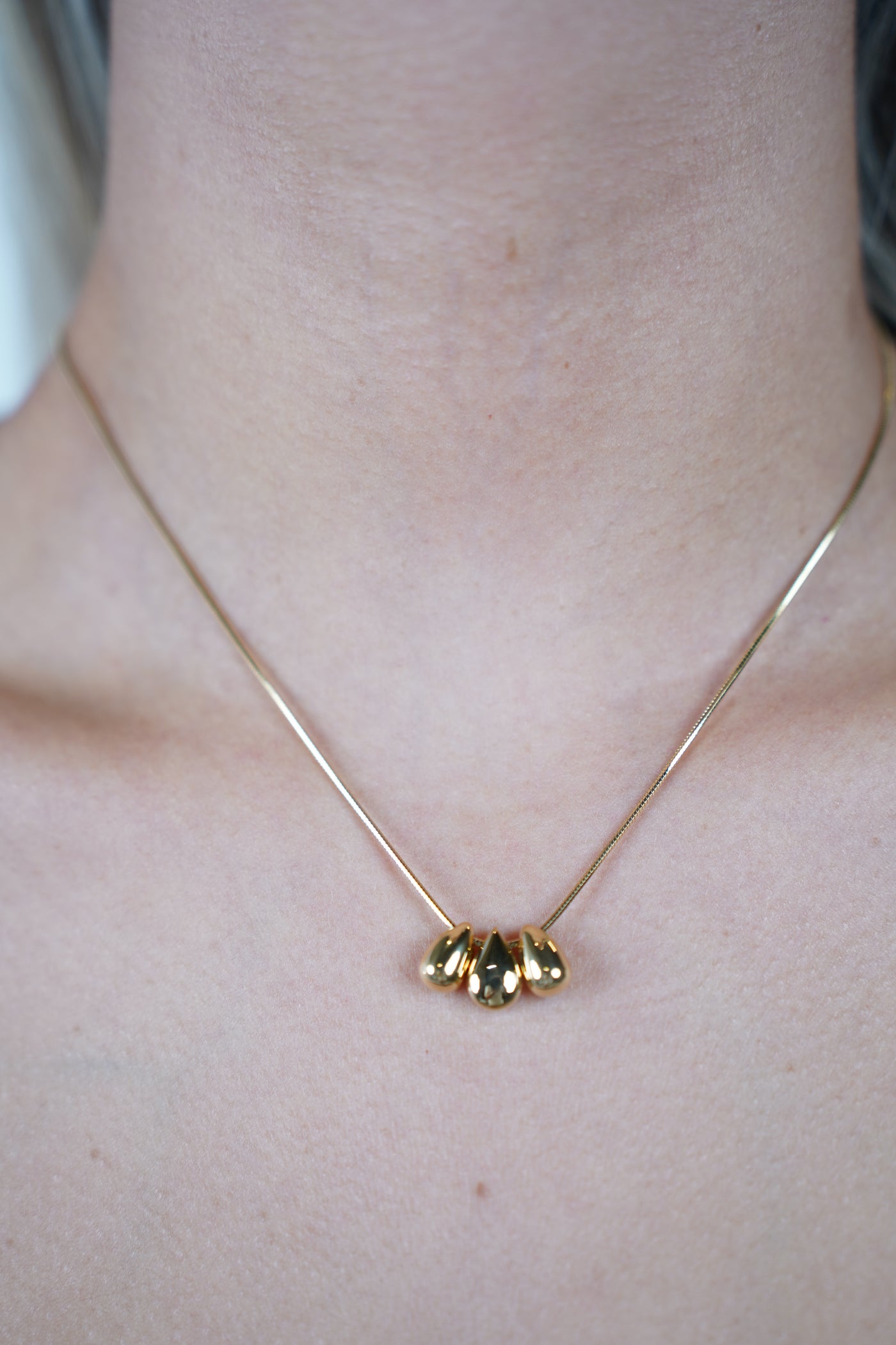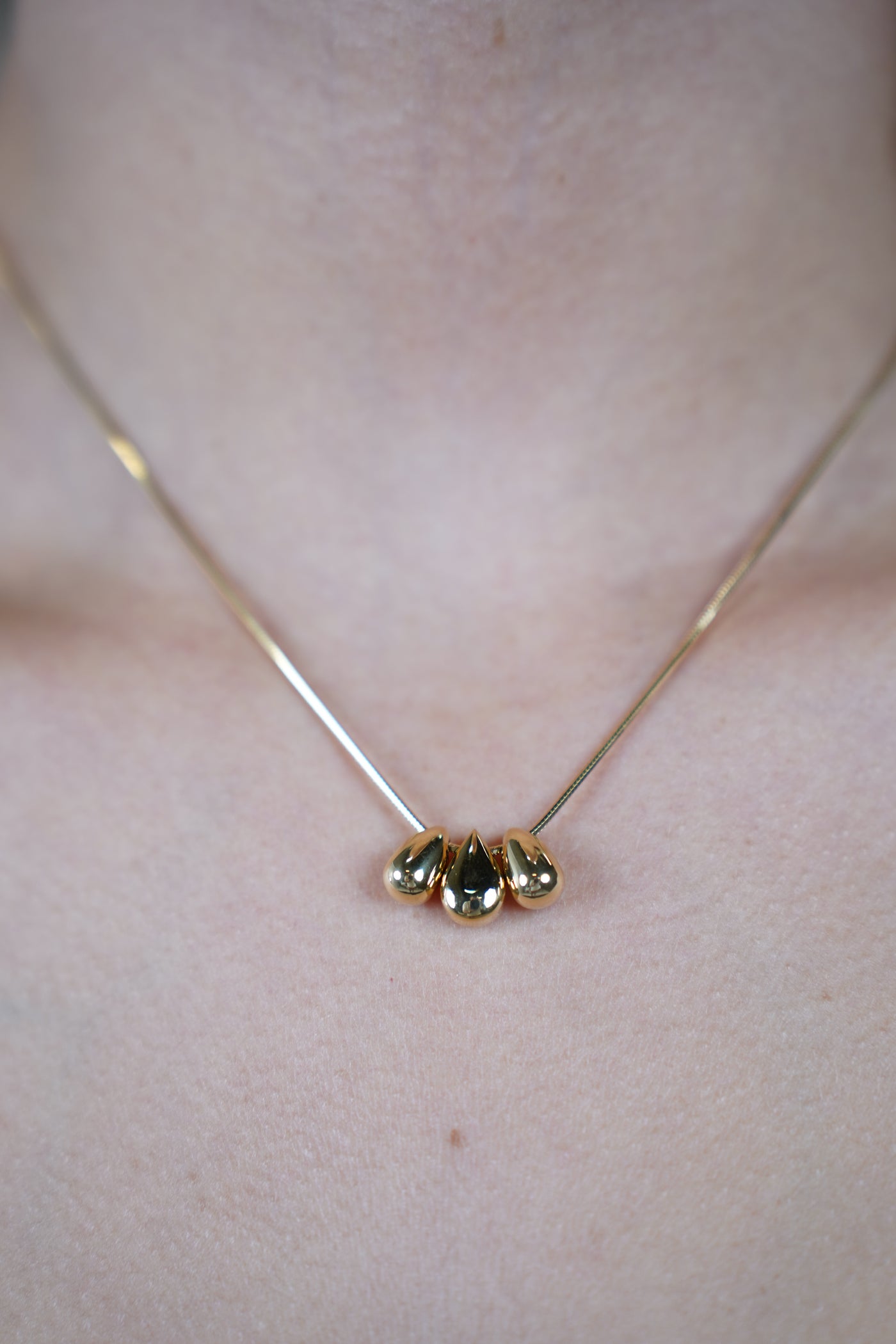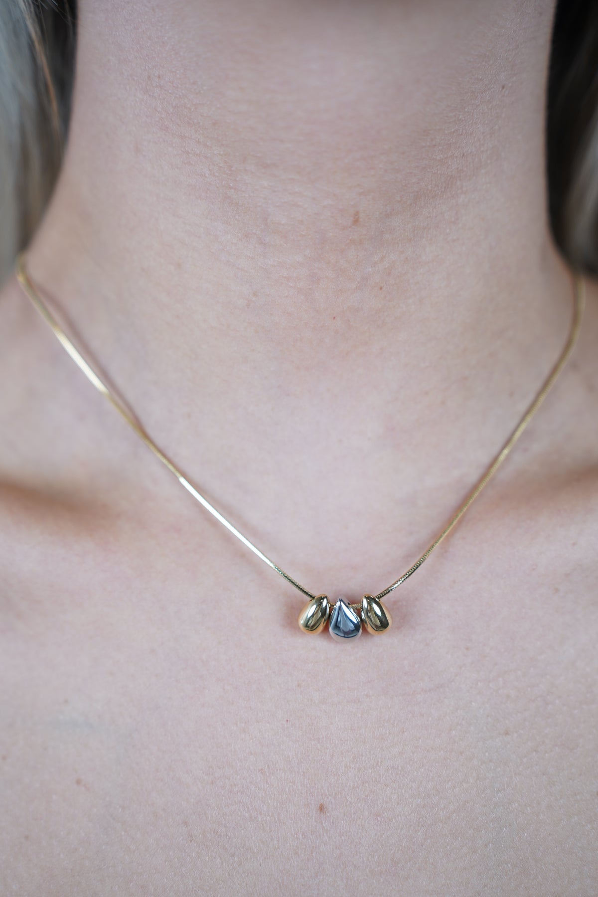 The Lani Tear Necklace is designed to elevate your everyday look with a subtle statement. Featuring a fine snake chain in a polished gold tone, it holds three drop-like metallic beads at the center—two in soft gold and one in a reflective, smoky silver-blue.