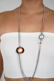 Necklace shown styled with a simple top to highlight its layered design and tortoise pendant.