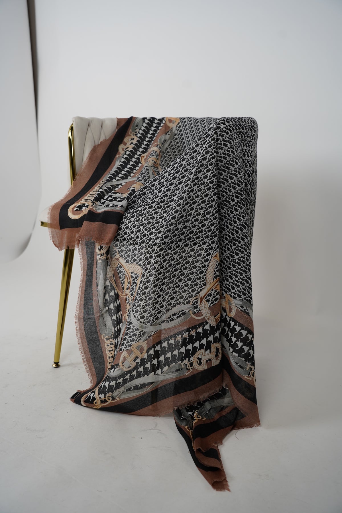 Meta Description: The Branna Scarf features chain and houndstooth prints in warm neutral tones. Style it your way for timeless elegance. Shop now at Carema Boutique.