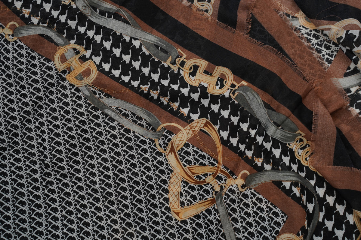 Elegant scarf with chain, houndstooth, and monogram patterns in black, ivory, and camel, draped over a chair.