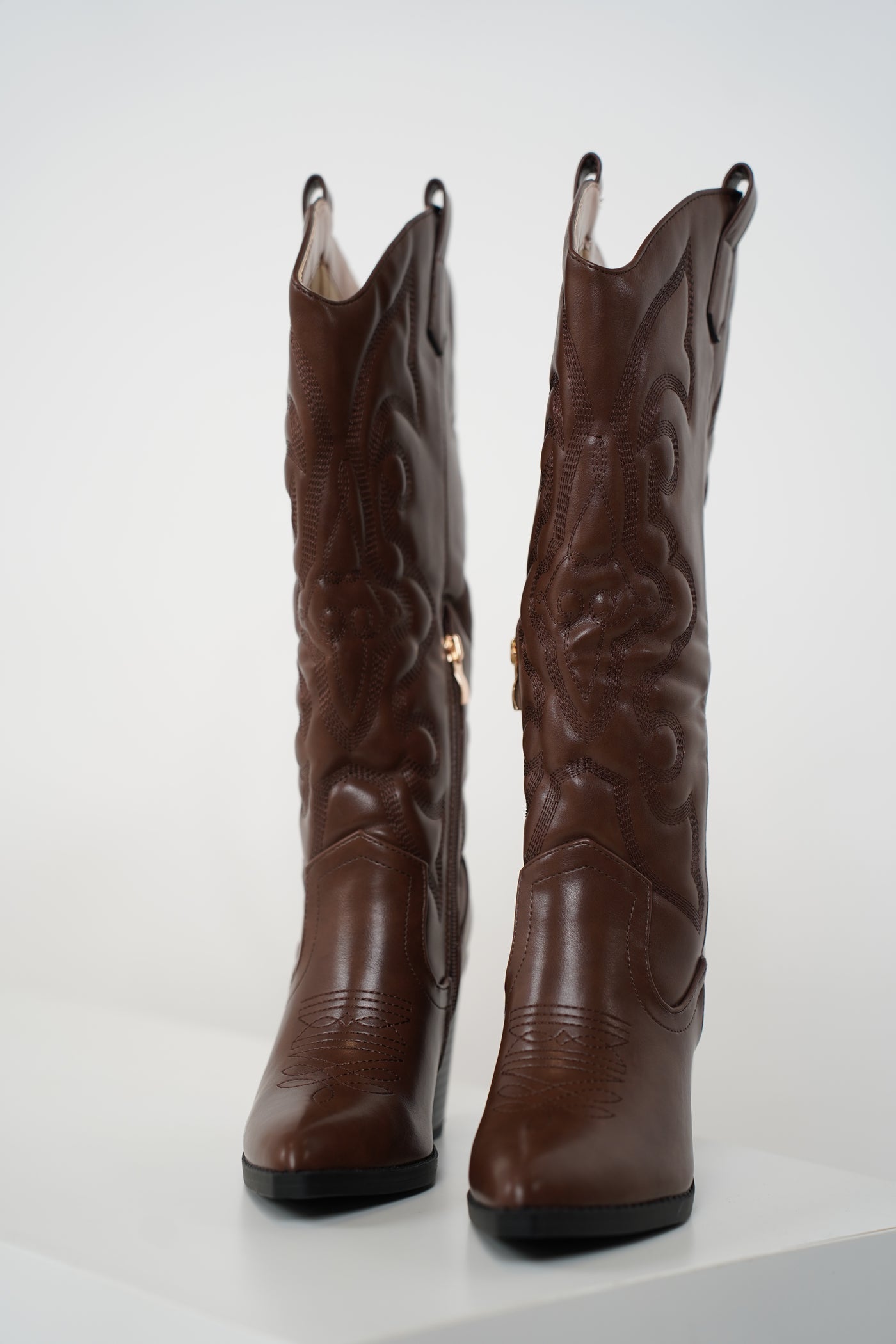 Step into elevated western vibes with the Arizona Country Boots. These knee-high black boots are designed with bold western embroidery, a pointed toe, and a stacked block heel for just the right amount of lift. The side zipper offers easy wear while the dramatic all-black finish makes them easy to dress up or down.