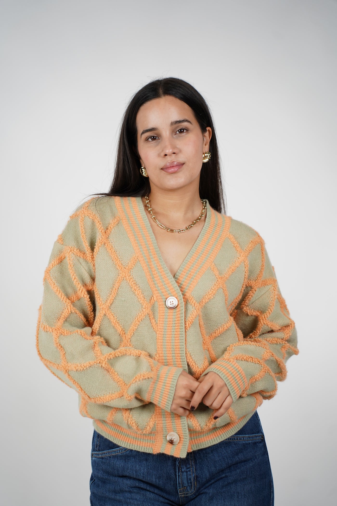 Woman wearing sage and peach diamond-pattern knit cardigan with buttons.