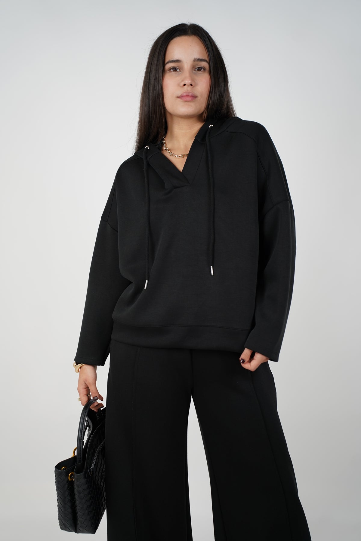 Shop the Selen Hooded Lounge Set — a relaxed black pullover hoodie and wide-leg pant combo designed for elevated everyday comfort. Effortless, minimal, and versatile.