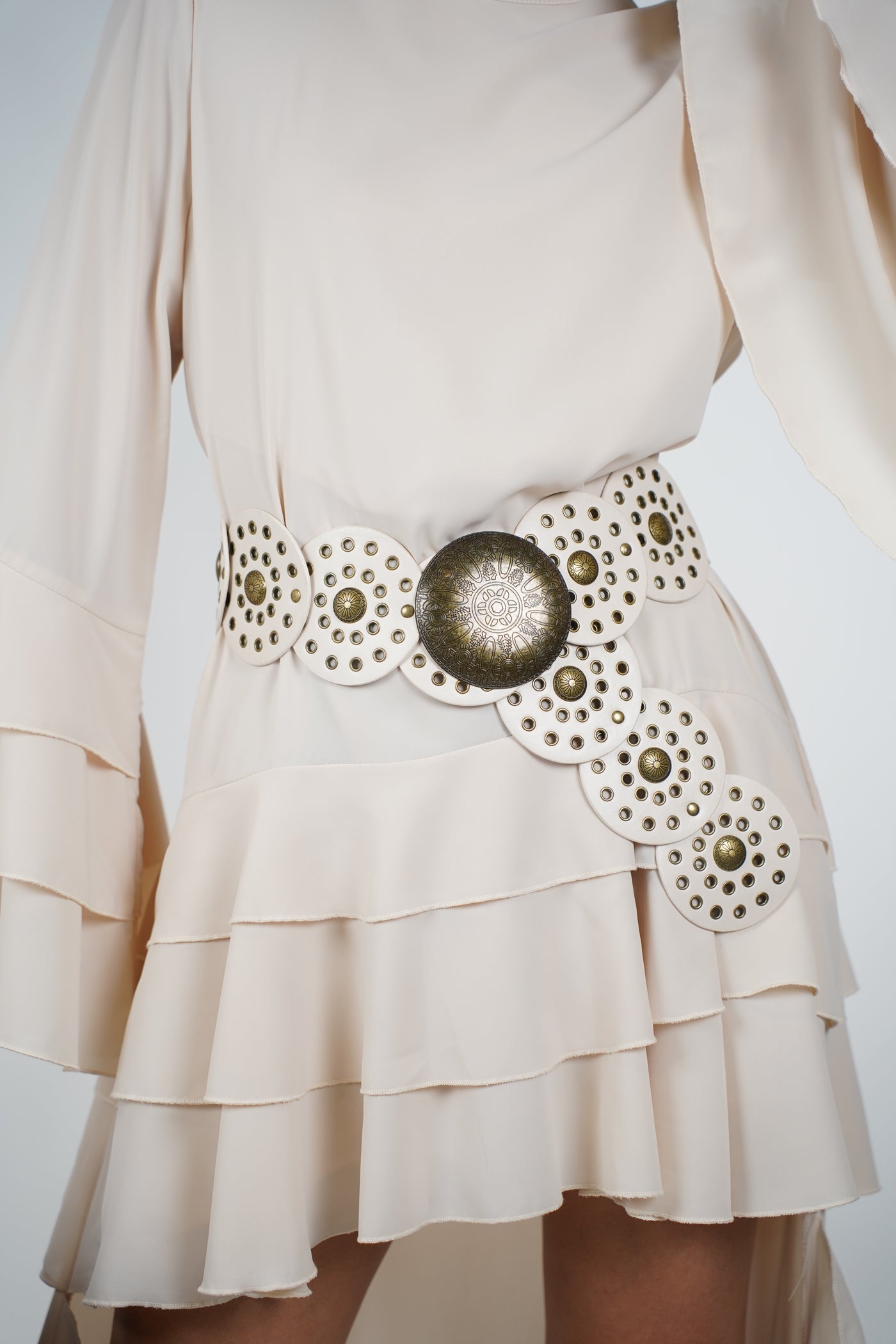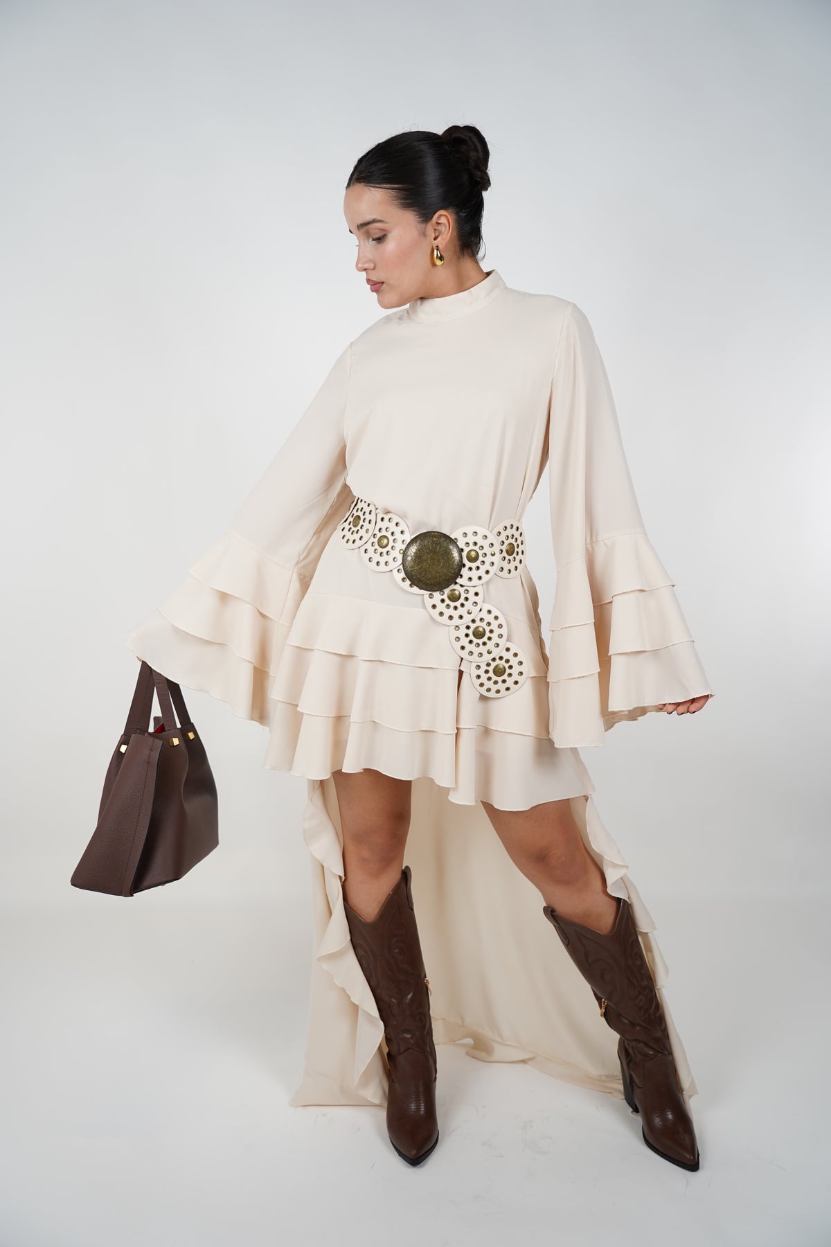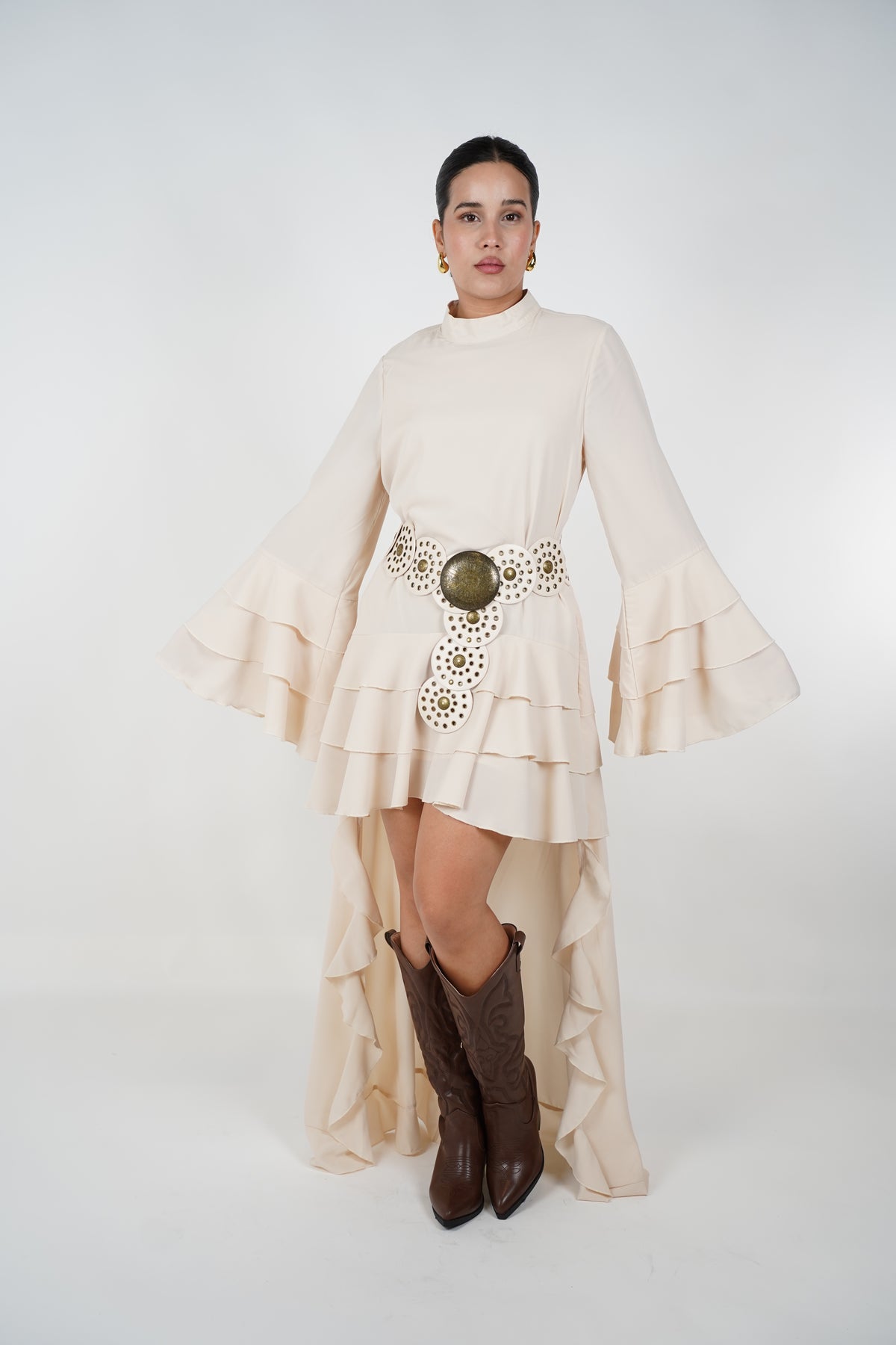 Woman wearing cream ruffle high-low maxi dress with bell sleeves, styled with western boots and statement belt.