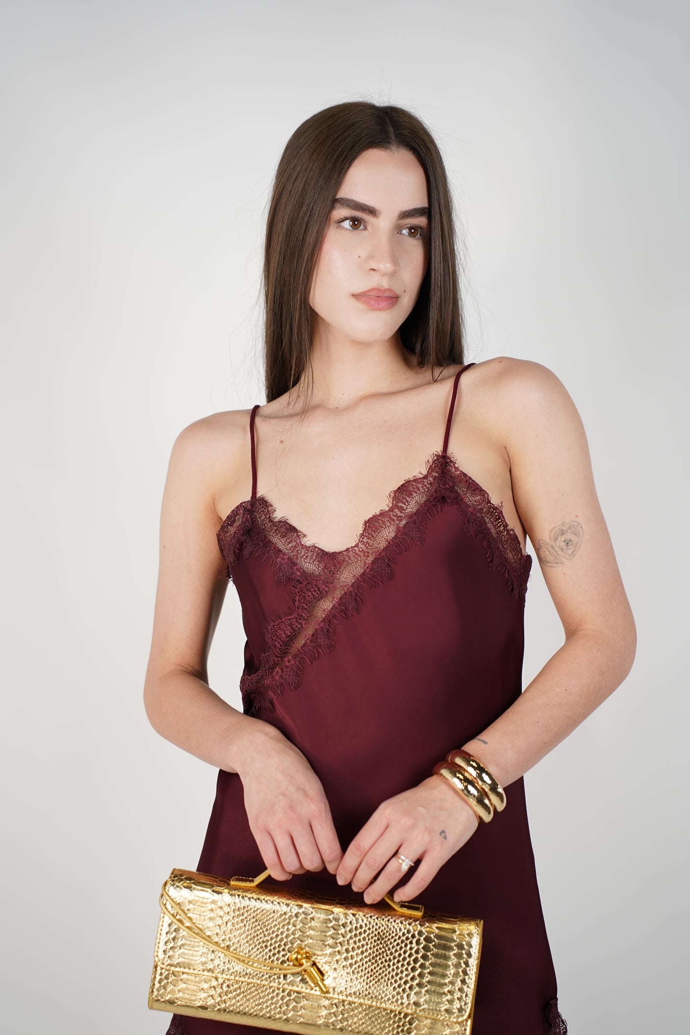 A sultry satin slip dress with delicate lace trim and an asymmetrical hem for effortless elegance.
