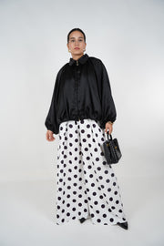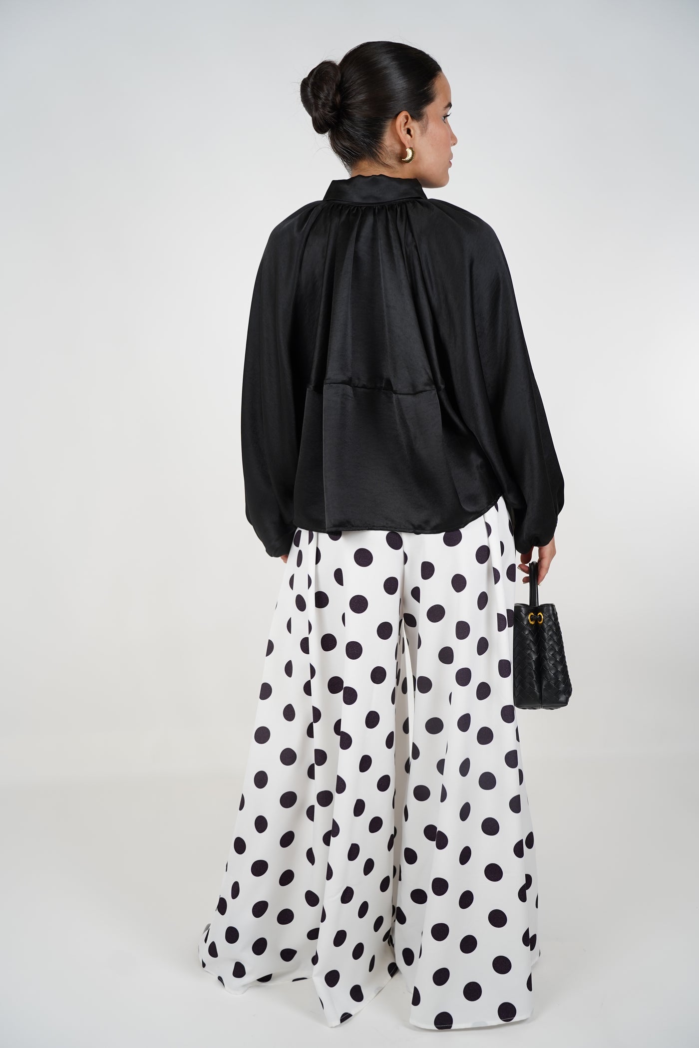 Add an instant statement to your wardrobe with the Ruby Polka Dot Palazzo Pants. Featuring a striking black-on-white polka dot print and a luxuriously fluid wide-leg cut, these pants deliver playful retro energy with a modern edge. The lightweight satin drape moves beautifully with every step, offering both comfort and impact. Pair with sleek tops for a night out or mix with bold textures for daytime fashion moments.