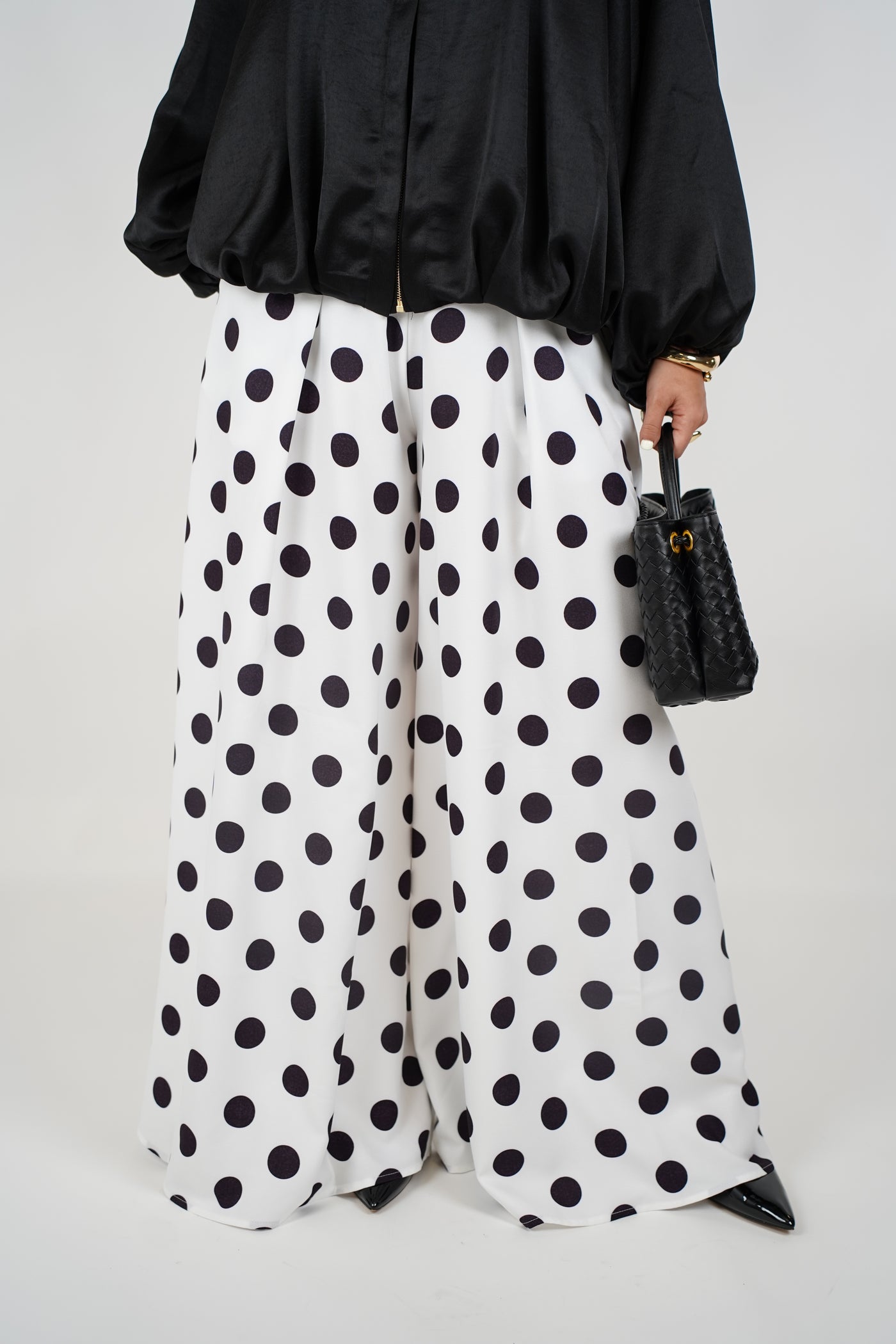 Wide-leg satin palazzo pants in crisp white with bold black polka dots and a flowing, high-drama silhouette.